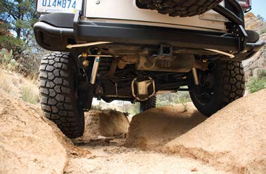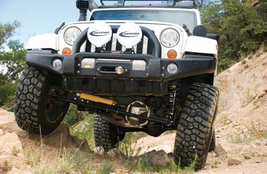 The Overland JK is based upon the Wrangler Rubicon Unlimited platform and then modified to support longer distance travel. Beginning at the chassis, the Jeep was fitted with an American Expedition Vehicles (AEV) 3.5-inch premium suspension system. This not only improved the ride, load capacity, and handling over the stock form, it also allows fitment of 35-inch tires. For tire and wheel selection, a set of BFGoodrich Mud Terrain KM2s was mounted on scrap spares from Grand Cherokees. The final chassis modification was the addition of a larger diameter rear anti-roll bar to accommodate the increased roof loads.