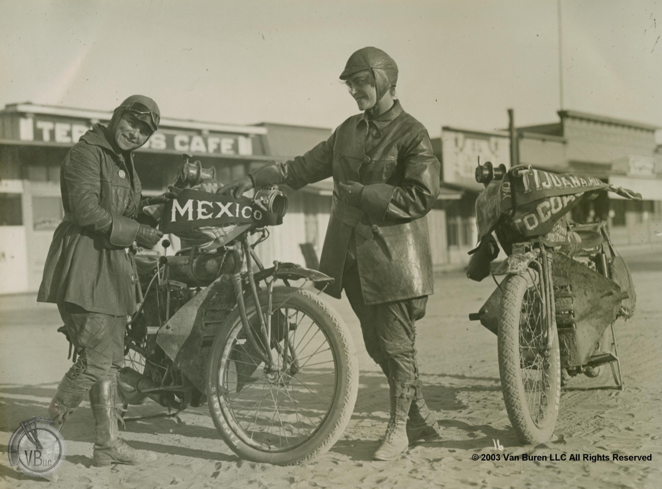 As the midday temperature in Skull Valley soared past 100 degrees and their 2.5-gallon fuel tanks inched closer to empty, Adeline and Augusta spotted a prospector navigating the desert by horse-drawn cart. Carrying a generous load of water and fuel, the prospector topped up the sisters’ gas tanks, replenished their water supply, and offered directions. The Van Burens continued through Nevada and California, with a quick stop in Tijuana, Mexico, before arriving in Los Angeles on September 8, 1916. They made history as the first women to cross the continental United States on their own motorcycles and the second and third women to drive motorcycles across the continent, following Effie Hotchkiss, who completed the route in 1915.
