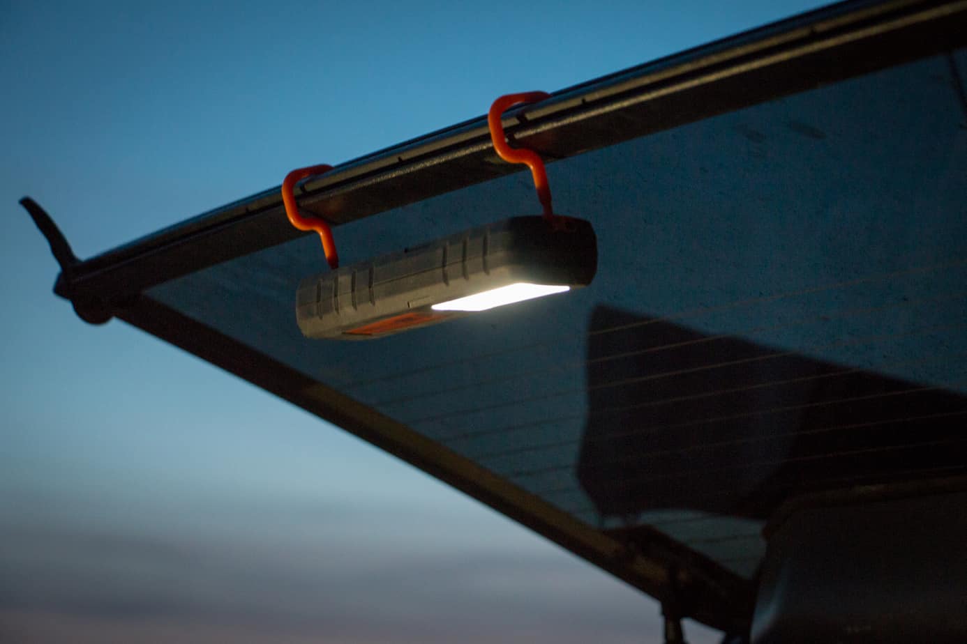 The second huge improvement was made in hardware. The new 600 features two fold flat hooks on the back and two high power magnets, a combination that seems to accommodate just about any mounting position you desire. The hooks fit perfectly on the end of an awning or the rear hatch of a vehicle, and thanks to their pivoting ends the light can easily hang facing downward, a notable weakness on the last model. We’ve found this setup to work best for illuminating a kitchen or cargo space, or lighting up a campsite for an evening of cards.