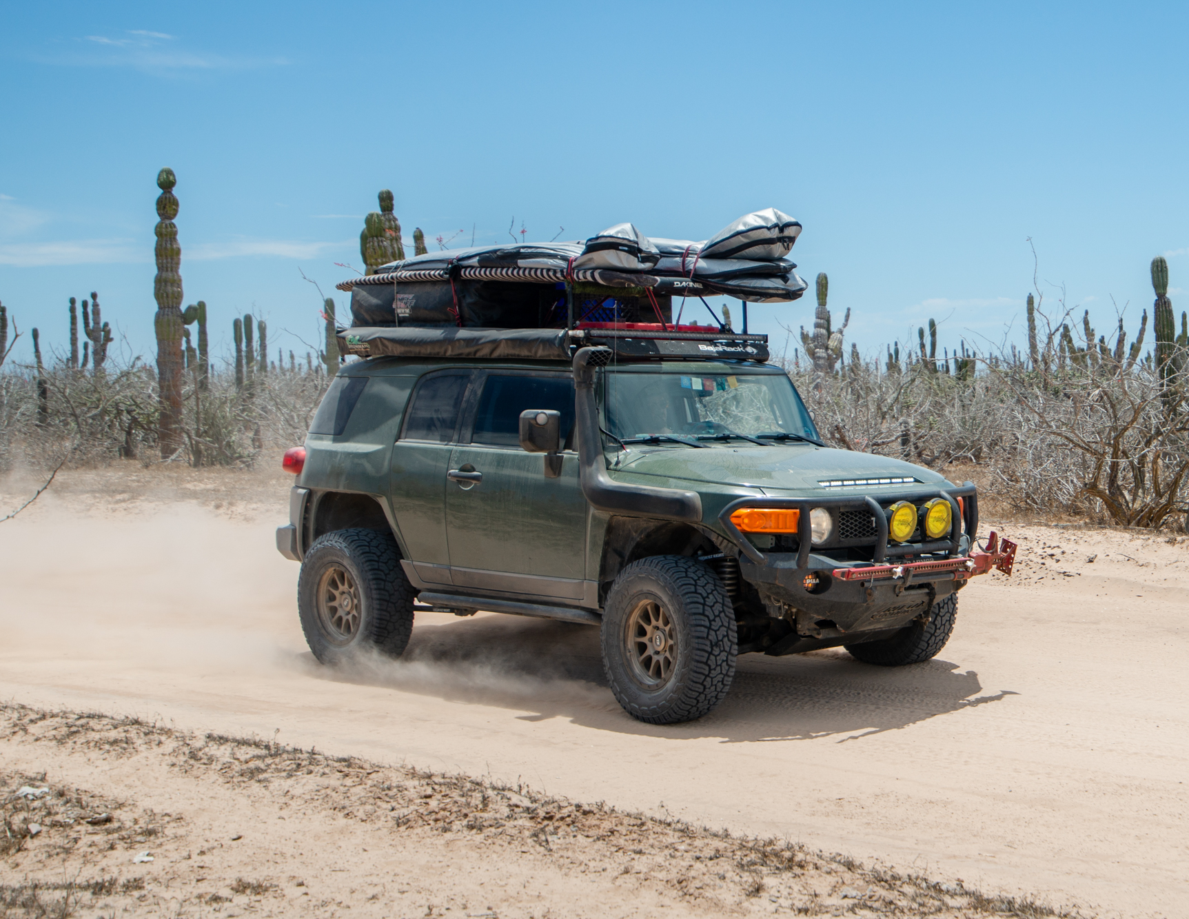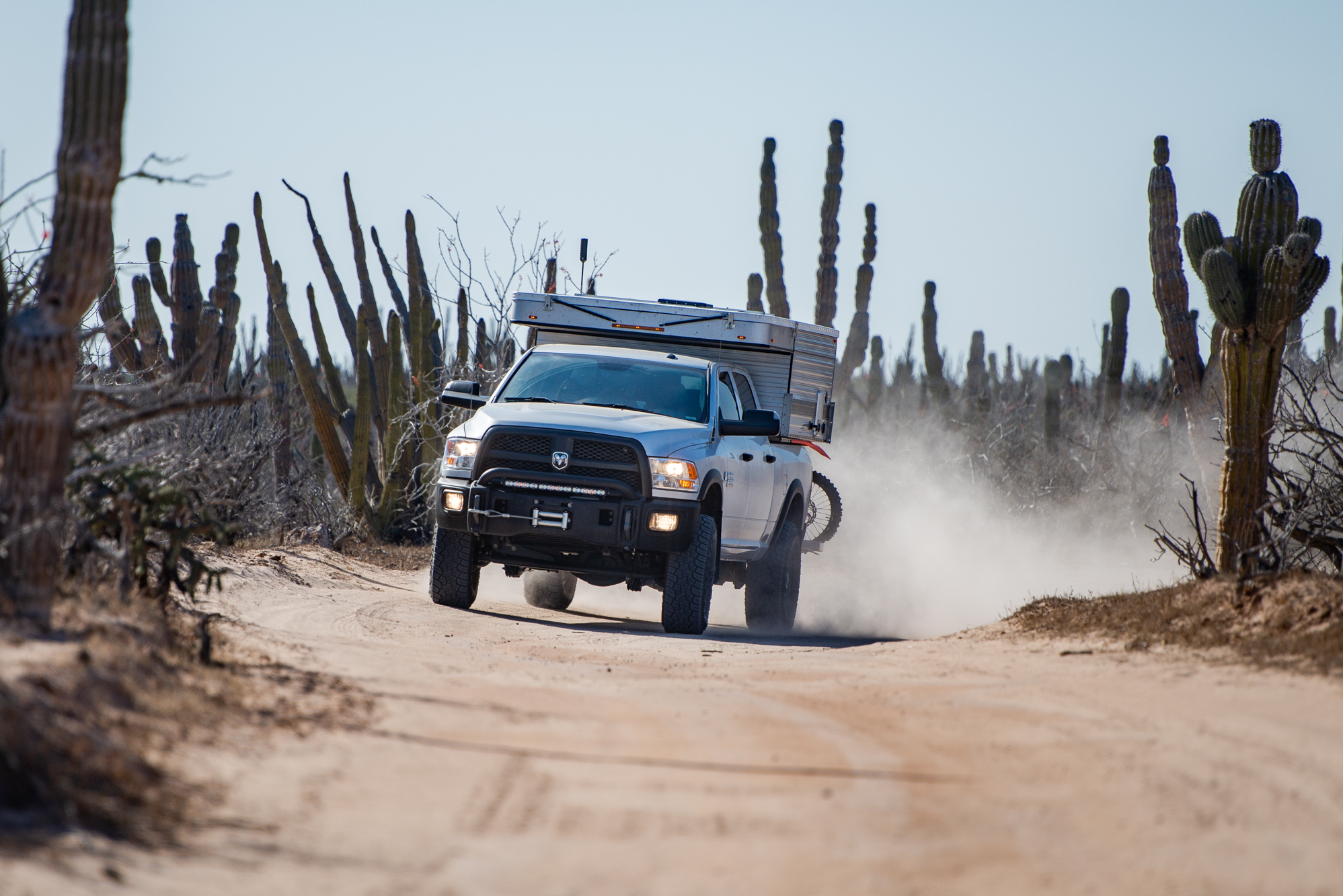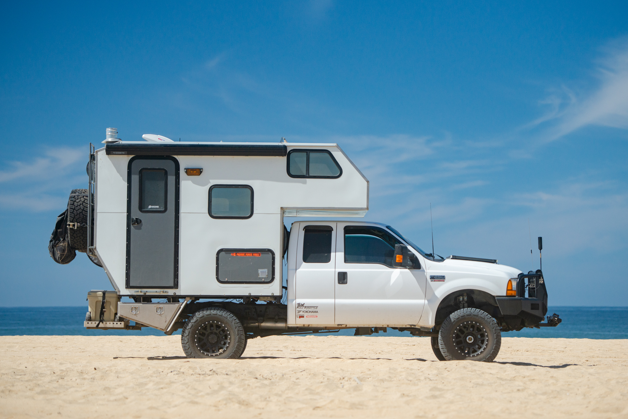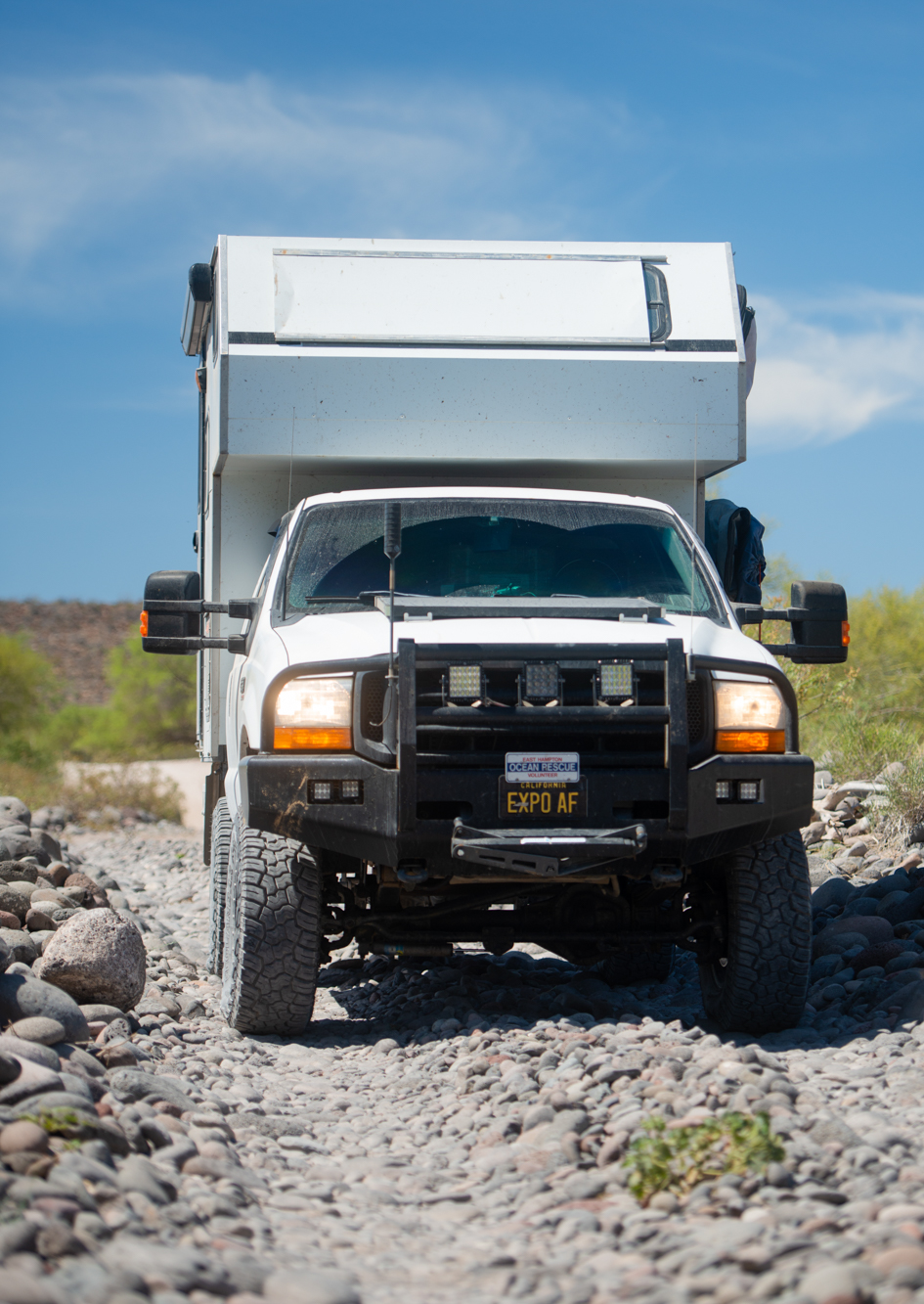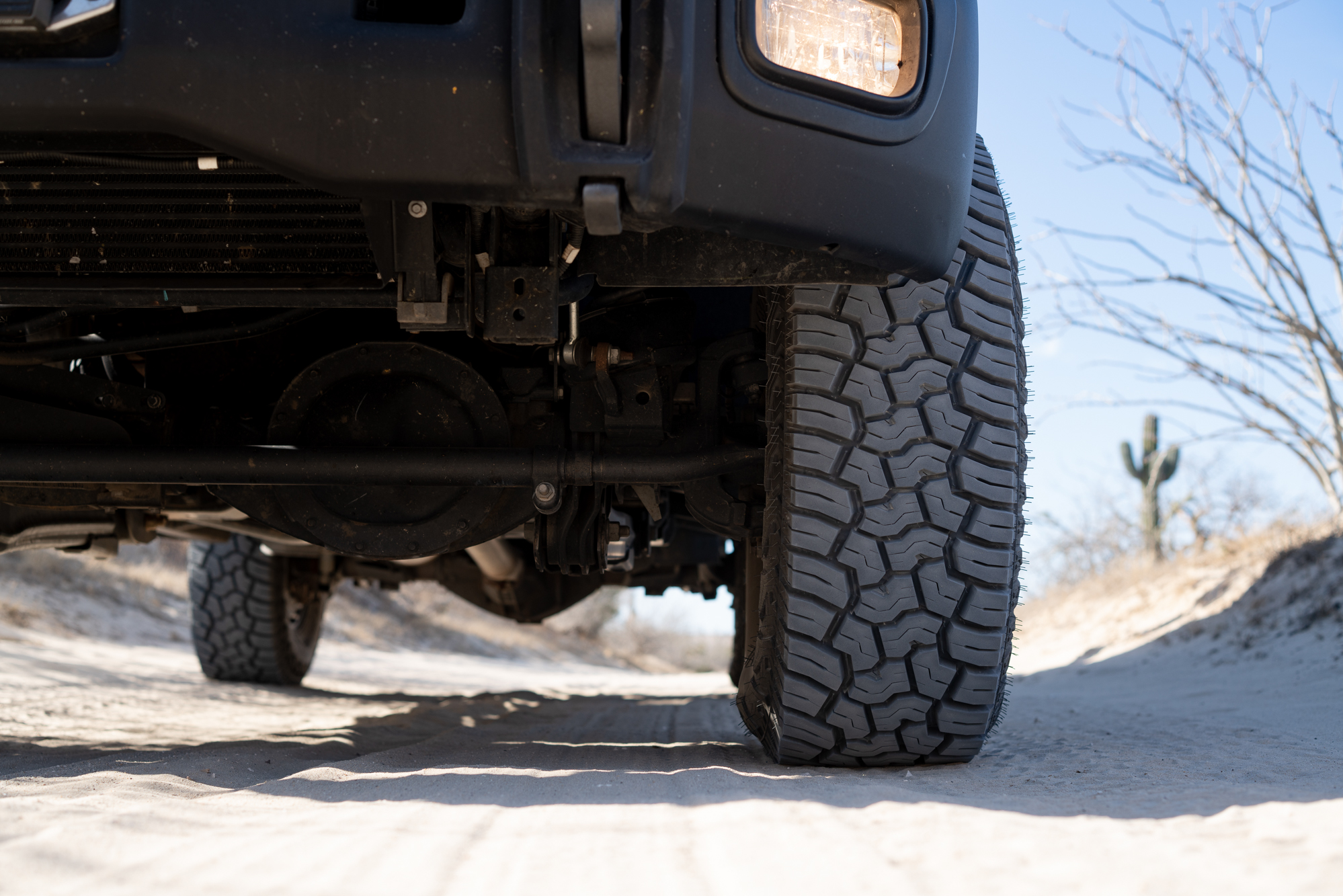 The peninsula has waves scattered all along its coastlines; some require you to drive across long stretches of washboard dirt roads, while others are more technical, or require driving lengthy deep sand beaches. For a truck the size of Bruce, sand is the biggest challenge, but I find momentum and adjusting tire pressure are the keys to success; tread pattern also plays a substantial role. Too large of a void between tread blocks can cause the tires to act like shovels and dig you down, but if the voids are too close together or too shallow, you’ll spin your tires trying to get traction. I feel Yokohama found the balance perfectly with the X-AT, utilizing a tread pattern and aggressive sidewall which retain enough of a void to maintain traction, without becoming so aggressive they sacrifice flotation. When aired down to 30 psi in the rear and 25 psi in the front I didn’t get stuck once while traversing the beaches of Baja, and it’s easy to bury a 6-ton truck to its axles.