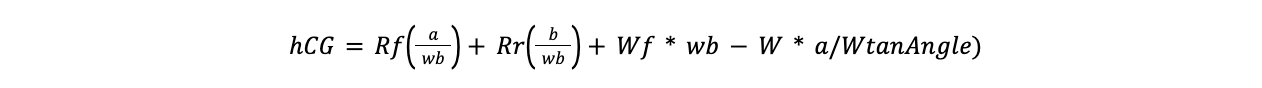 We want to find where the CG is between the wheels then compute the height of the CG. Use the formula below, or make it easy on yourself and use the online calculator at www.s2sx.com/calc.
