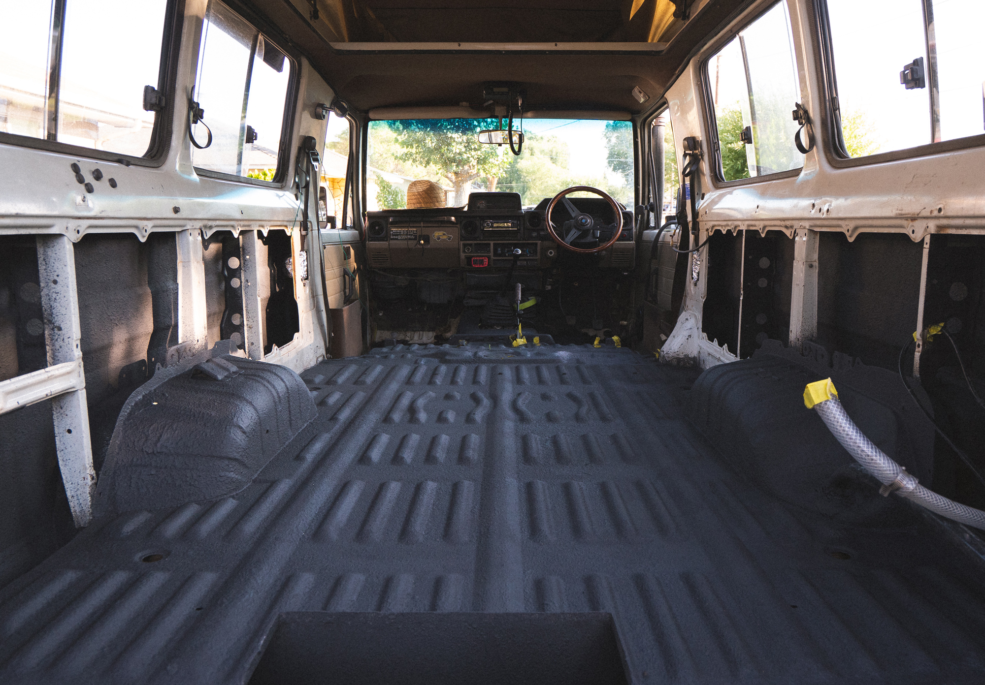 About an hour later, we got started on the second and final coat of the day. When applying both products, the sound control needs to be sprayed first and fully cure for 24-36 hours before applying the ceramic insulation. It was a long but easy process to spray four coats on the floor, inner walls, and hood of the Troopy. Once the final coat was done curing, I stood at the back of the vehicle, amazed at the transformation. Two weeks prior, the interior was sticky, smelly, and rusty. Now we had a solid, incredibly polished base to start building out the cargo area. The real question was what level of acoustic and thermal performance we would get out of the Lizard Skin products.