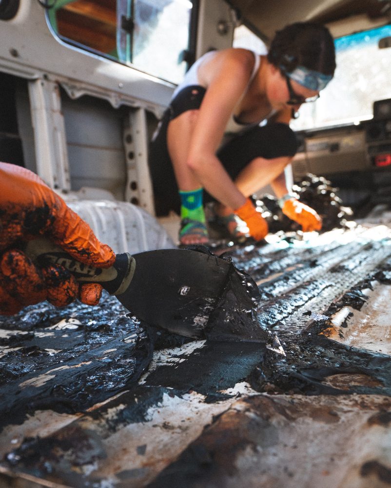 Our first thought was to use a butyl mat for under the hood, but the Noico in the cargo area had melted and deteriorated simply from the interior temperatures and the impact of walking and standing in the cargo area during weekend trips. The rubber adhesive was also prone to serious off-gassing, filling the cab with a chemical scent in the heat of summer. For those reasons, we were hesitant to install another butyl mat, even from a higher-quality brand. We weren’t sure what other options were out there, which left us at a standstill in the build.