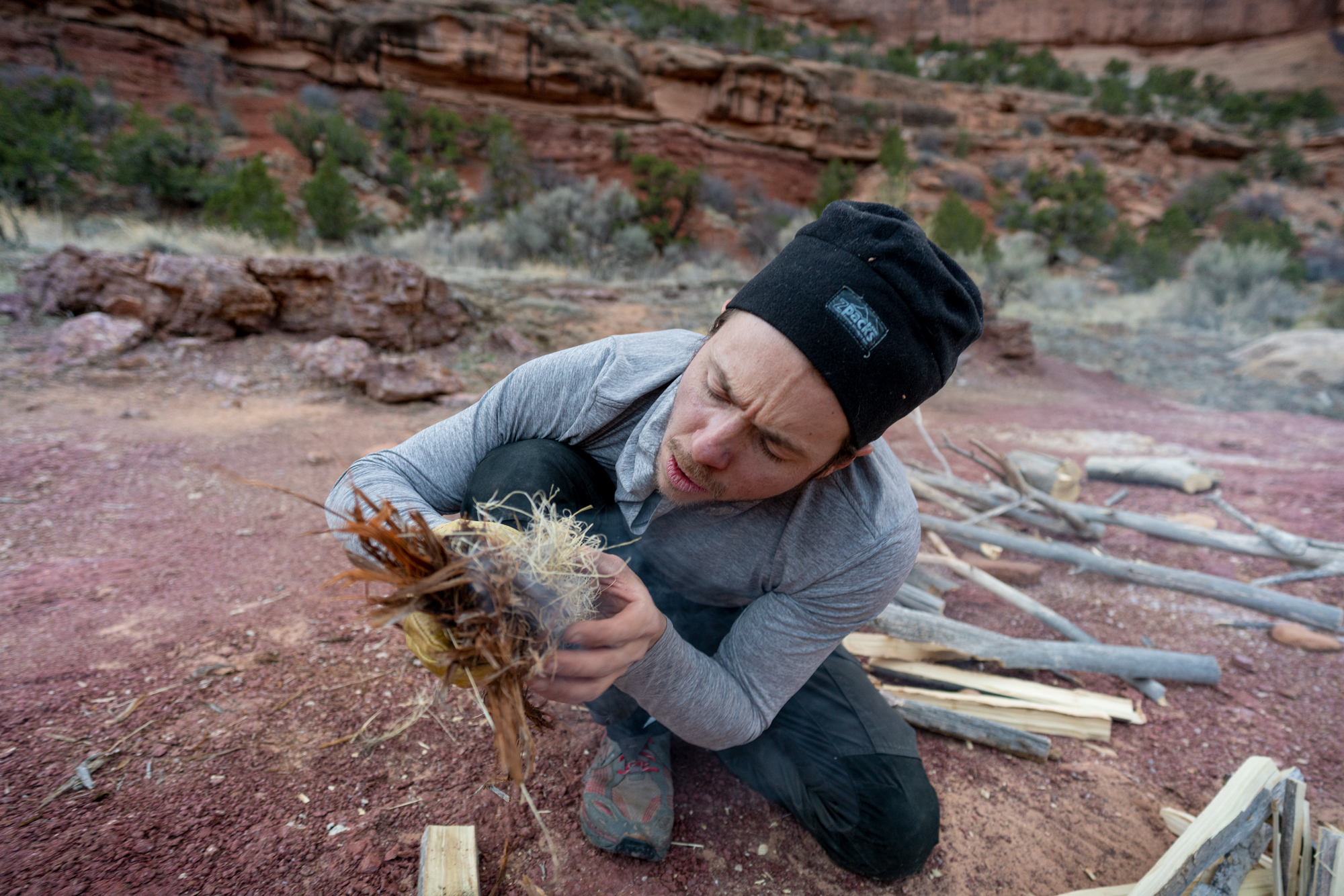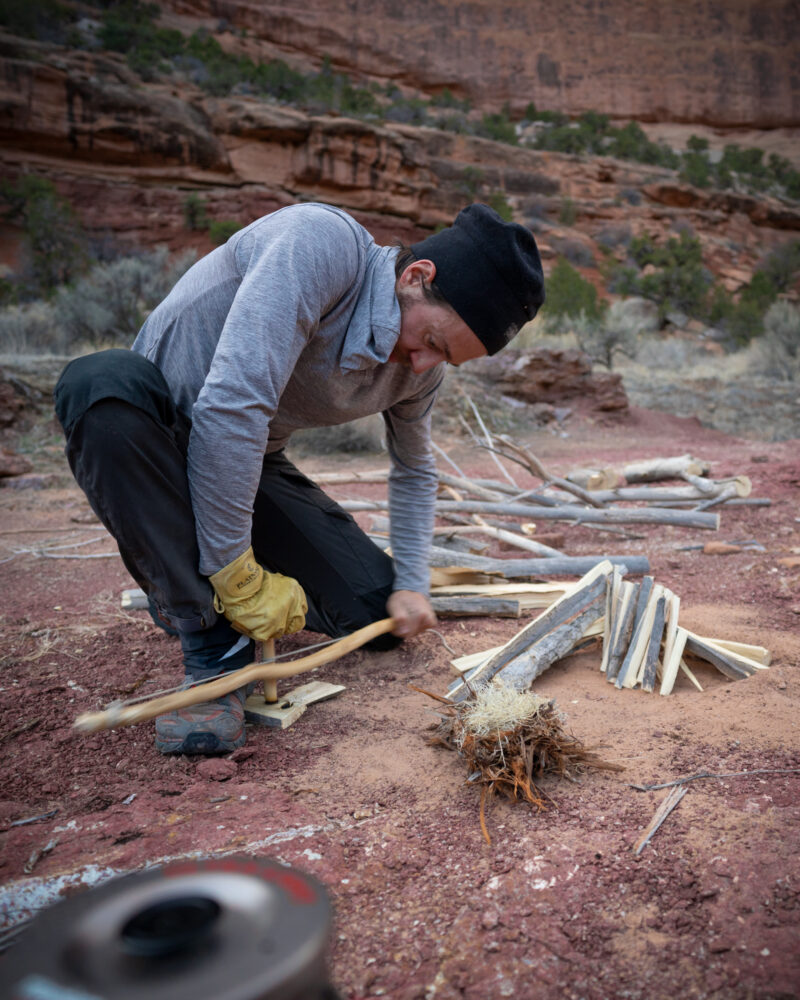 Below Left: Preparing materials for a primitive bow-drill fire. Below Right: This technique relies on friction to create an ember.