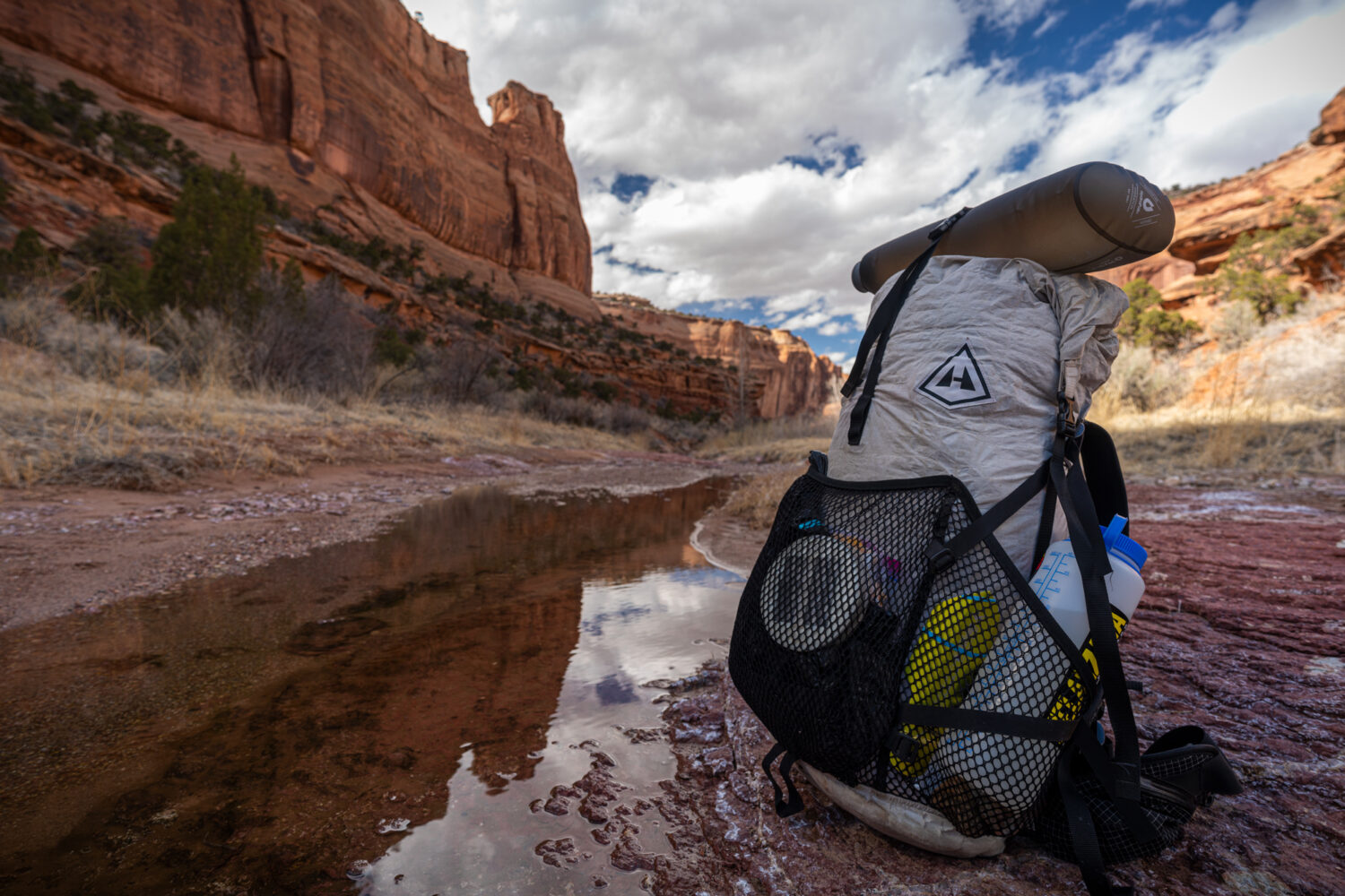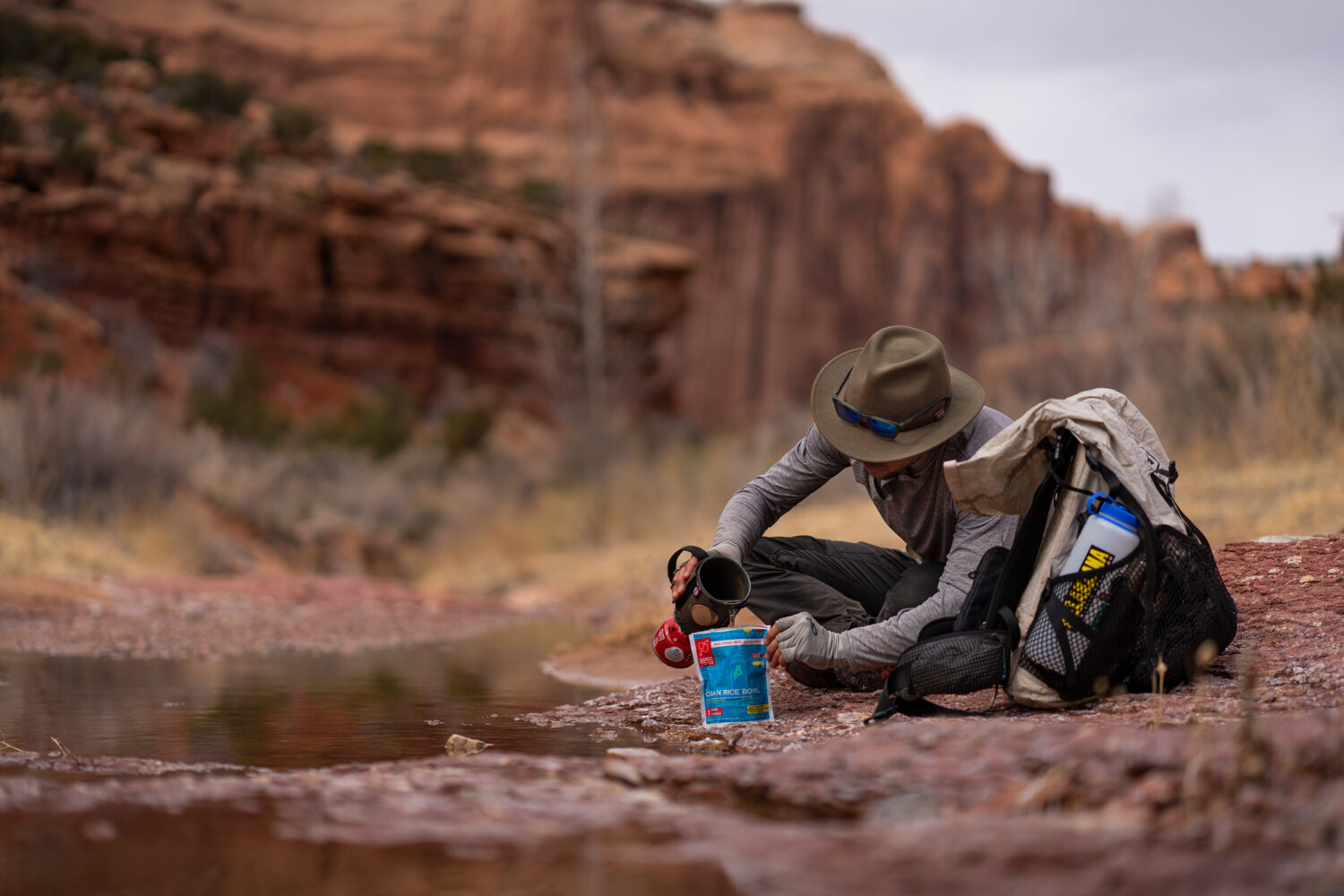 Below Left: Filtering water. Below Right: Taking a break at a water source—notice the four liters of water strapped to the top of my pack.
