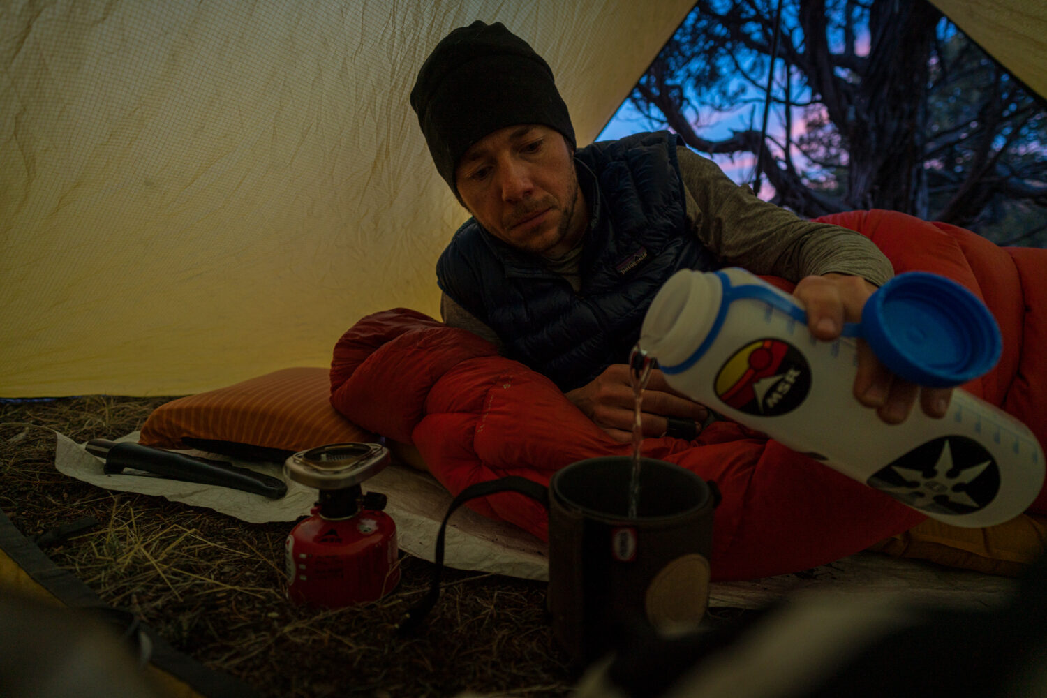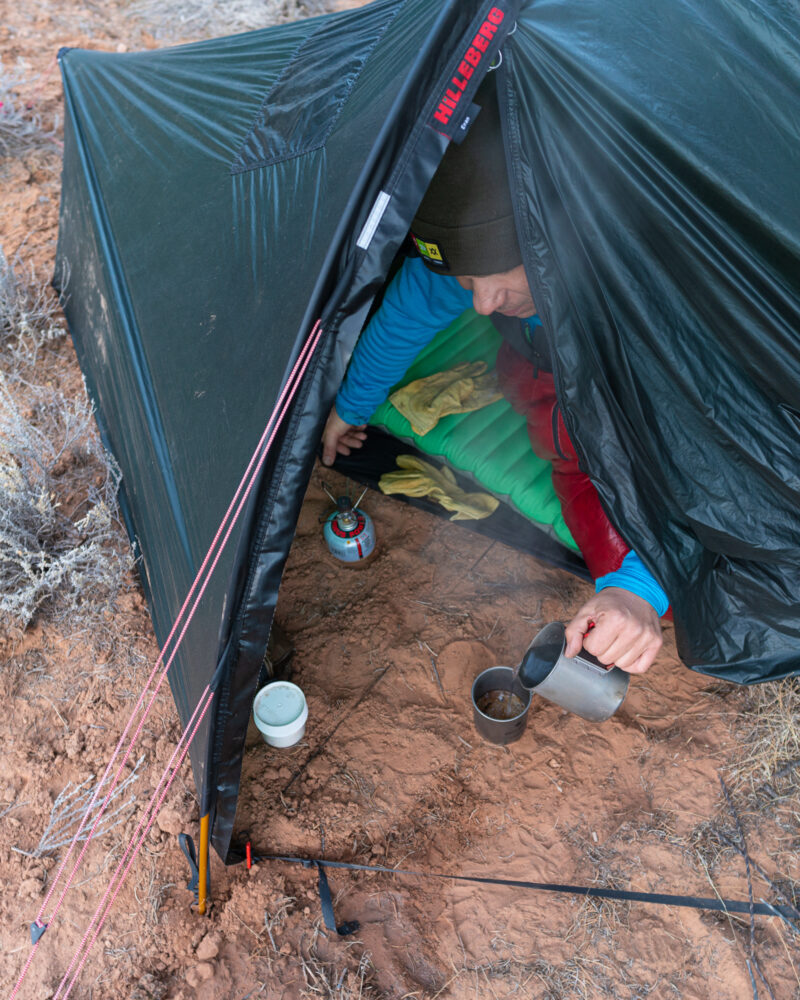 Below: The author, making some coffee in the comfort of his sleeping bag.