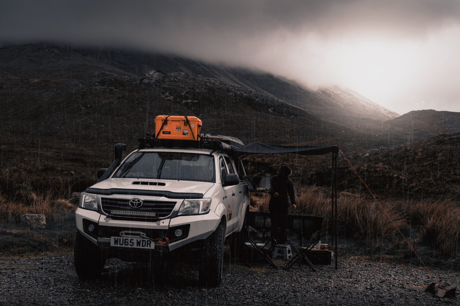An hour’s drive northeast on the shore of Loch Torridon led us to a tiny place sandwiched in the Torridon Hills. Strange that the village is called Torridon, I mused. Winter hadn’t loosened much of a grip on this part of the Highlands as we encountered a deluge of rain. As quickly as we could scramble, we took refuge from the torrid weather, diving in the Annex to cook and into the rooftop tent to relax. The day lurched on against a darkening vault of sky in which the seabirds rose and dove like torn scraps of rag. I groused. By morning, the weather hadn’t ceased, so without further ado, off we headed in a brighter, southwesterly direction to cross the Skye Bridge.