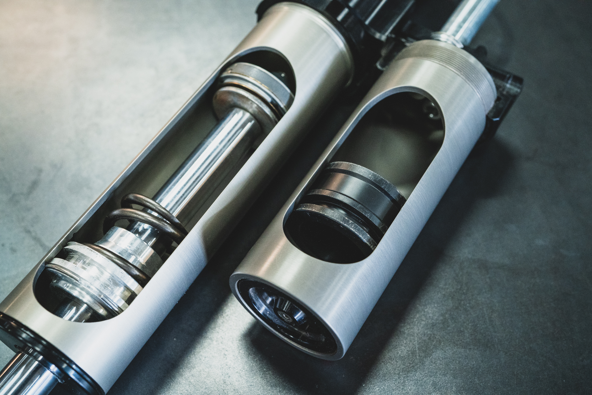 The system installs easily, with additional time required to install the ECU, IMU, and run the harness to each of the dampers. Each shock has an integrated electromechanical valve that controls the rate of fluid flow between the main shock body and the reservoir. This valve has full proportional control, which permits variable control throughout the entire valve range.