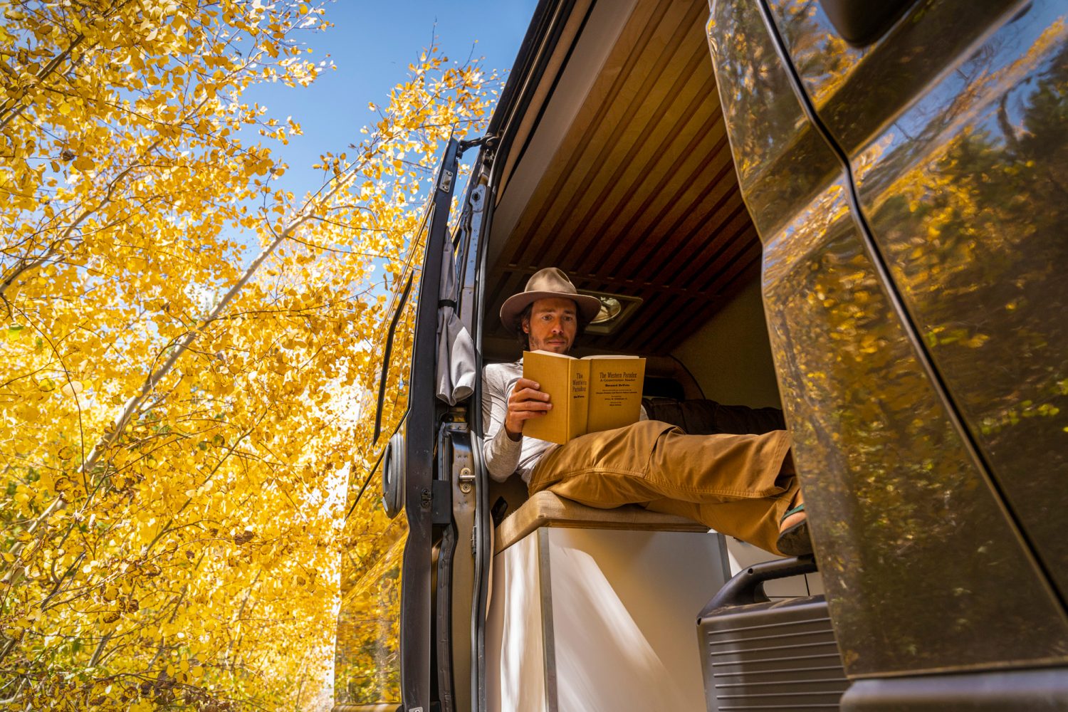 Onward, to Arapaho Bay, a small cove on the edge of Lake Granby. Dotted with a collection of Forest Service campgrounds, private cabins, and lake access points, it is an extremely popular destination, although the benefit of visiting mid-week was solitude. It was one of those moments in the campervan that I reflected on the freedom of traveling within a self-contained home. And while there were (and still are) concerns surrounding travel during COVID-19, my personal reality is that life must go on (along with a face mask). Aside from trying to find the best fall foliage to photograph, I had no specific agenda and no rigid timeframes. So I parked the Promaster, opened the sliding door, and took an hour break from driving to dig into a book.