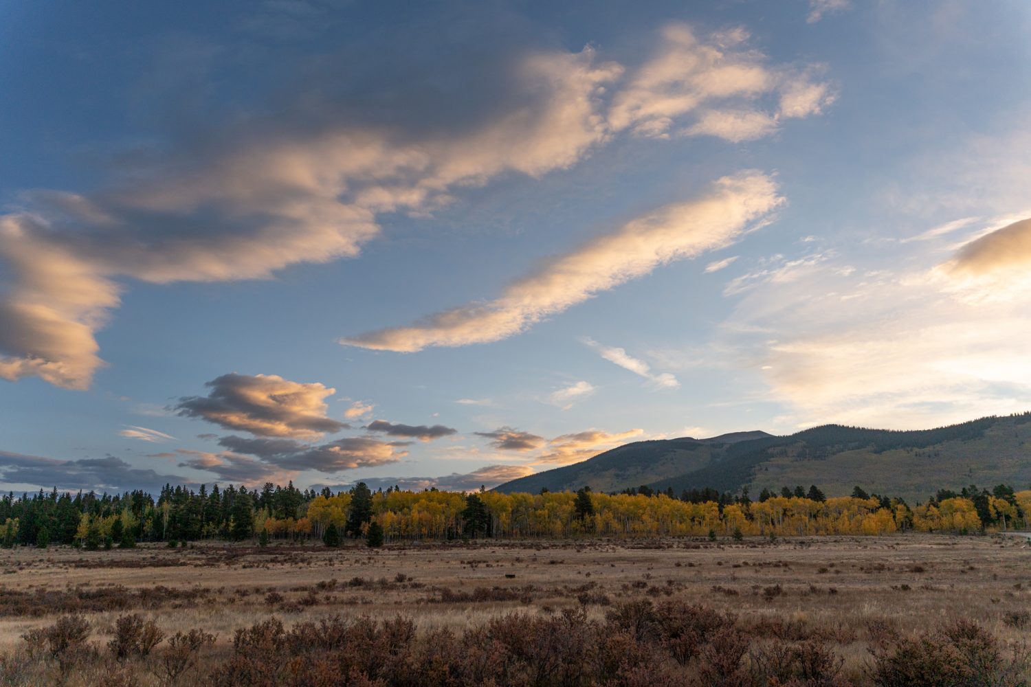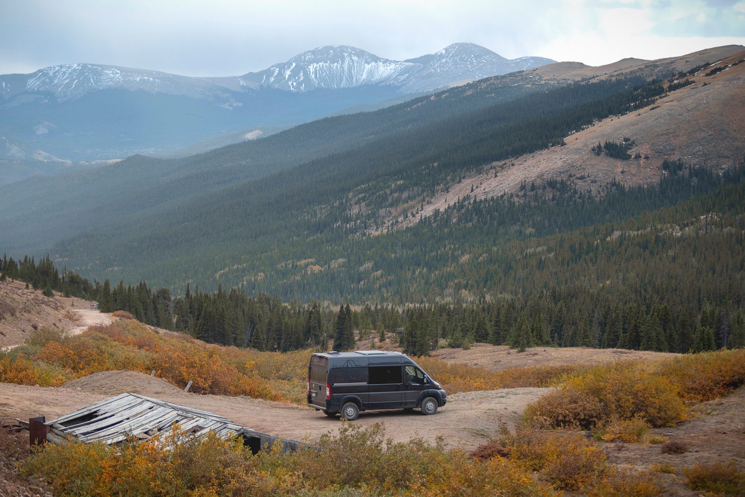Close to the summit of Weston Pass near some mining ruins, we found a great place to pull over and refuel. It had been a long day of driving, and after successfully finding foliage and spectacular mountain scenery, we were ready for a well-earned break. Royal proceeded on his usual campsite patrol while I got the campervan as level as possible before putting together some dinner and enjoying the sunset. Clouds drifted across the pass, dropping moisture that speckled the windshield with tiny, frozen water droplets. It’s that time of year in Colorado’s high country where snow is entirely possible. Without cell service, and unable to get an updated weather report for the area, we played it safe, packing up and continuing our drive down toward Fairplay in the dark. Much better to find another place to sleep for the evening, I thought, than to wake up to the steep dirt road covered in snow, without snow tires or all-wheel drive.