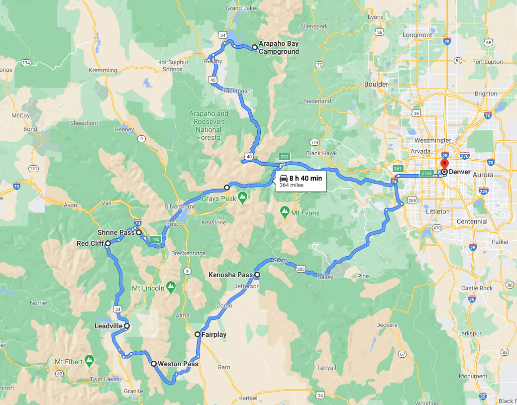 The route: Denver to Lake Granby, Shrine Pass to Red Cliff to Leadville, Weston Pass to Fairplay, and Kenosha Pass to Denver.