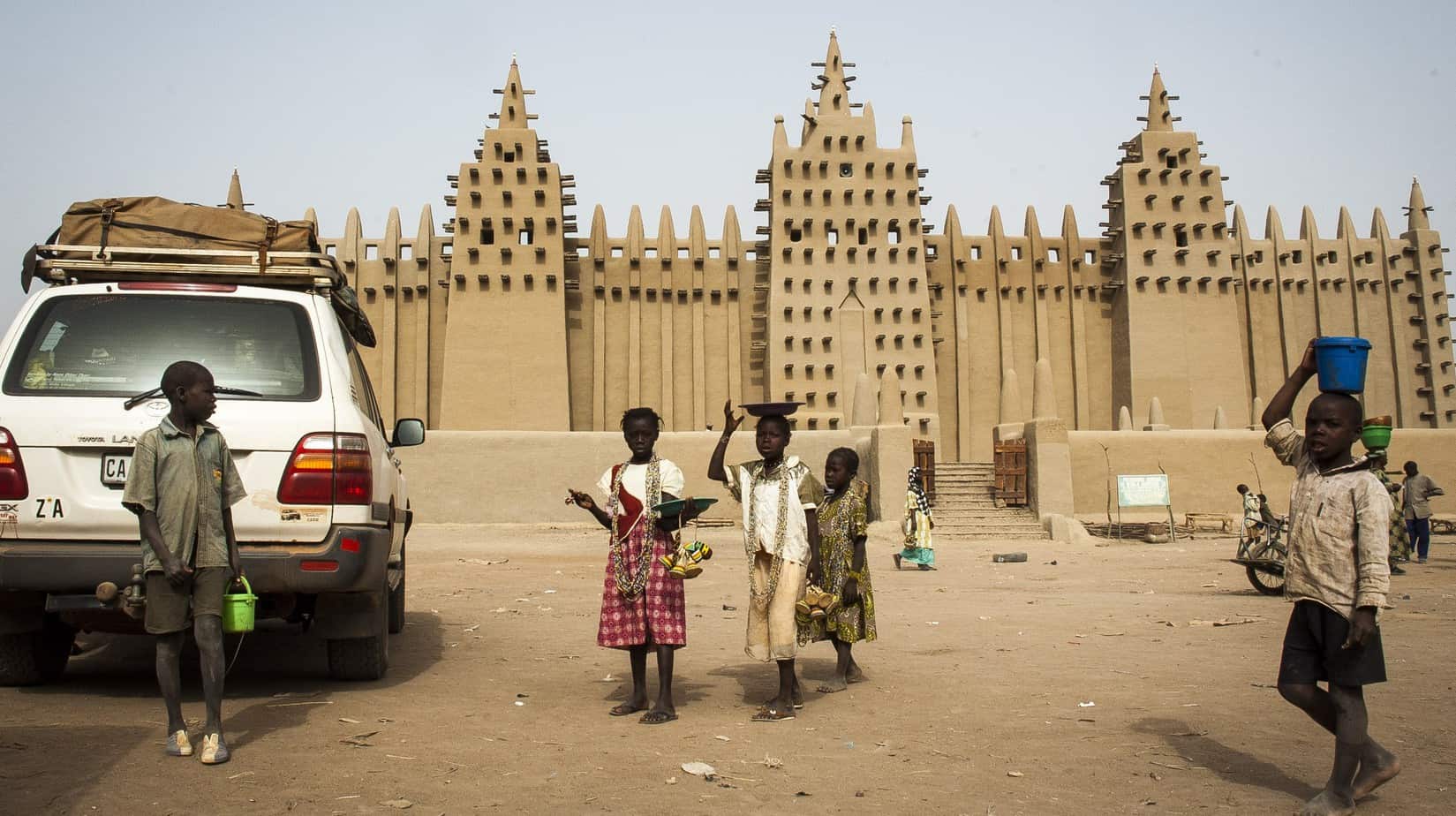 On our way to Bamako, we stopped at the city of Djenne to visit the Grand Mosque, a UNESCO World Heritage Site. Following the T4A maps, we crawled past donkey carts, open sewers and the bustle of a market town. Pulling into the main square, we were surrounded by the now-familiar aggressive shouting squabble of sellers, hawkers, guides and would-be guiders. We left them behind to take some photos, and a young, calm chap approached us; another guide, and we liked his manner. ‘Bob’ was 22 and spoke excellent English. He could get us to the high spots for photos and would speak to the Imam about letting us inside the mosque (not without some Baksheesh, mind you). The Grand Mosque in Djenne is one of Africa’s greatest wonders, and is the biggest Adobe (mud structure) in the world. It is the oldest city in Sub-Saharan Africa, situated on an island surrounded by the Niger and Bani rivers. Founded by merchants around 800AD, Djenne was Mali’s most important trading post in the 16th Century due its trade links with Timbuktu and location close to the salt and gold mines. Djenne has many Koranic schools (approximately 20) and attracts students from all over West Africa. It is also a pilgrimage site for many Muslims. The Mosque itself is made from sunbaked mud bricks using a mud mortar with walls up to two foot thick in places. This helps the mosque stay cool as it can hold up to 3000 people!