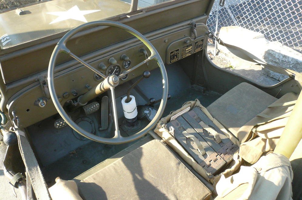 The interior is spare, with just enough room for a couple of ammo boxes and a roll of TP. The left transfer-case lever engages the front axle; the right one engages high or low gear.