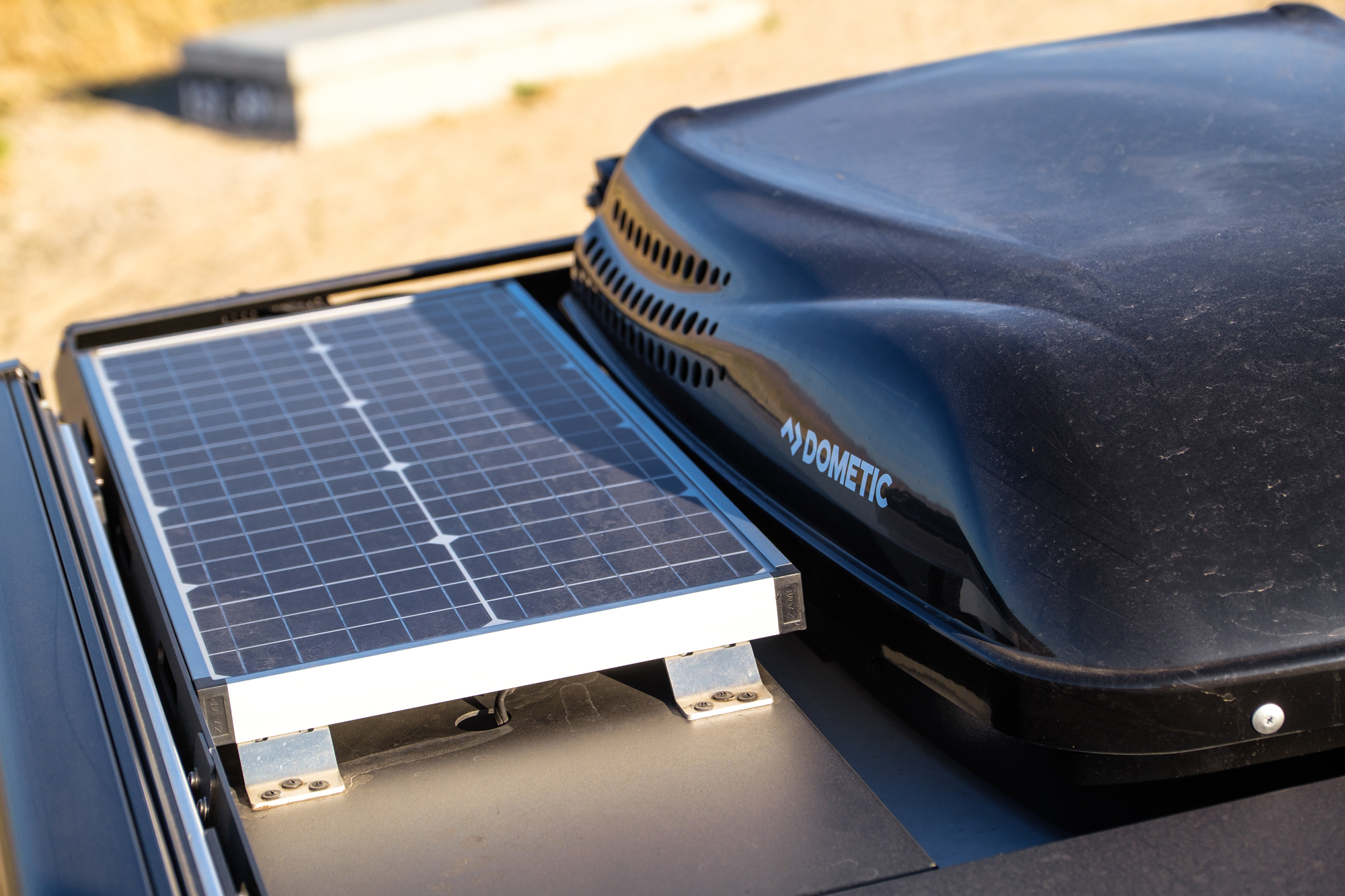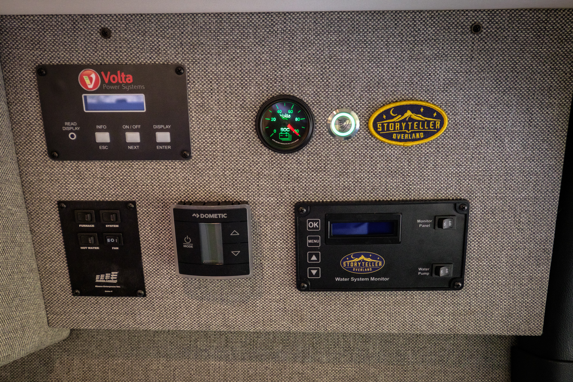 Storyteller lists the Mode as having a 12 kilowatt-hour (kWh) battery managed by a Volta power system, but it’s actually 13.6 kilowatt-hours or about 230 amp hours at 58 volts. The 12kWh is usable energy, which gives the van just over 200 amp hours for whatever you want before the safety measures kick in. With a 3,600-watt inverter, we were able to run the microwave, induction cooktop, charge laptops, and run the lights all at the same time without an issue. Even with this sort of aggressive power consumption, we only drained the battery to around 50 percent, which recharged quickly, thanks to the high output auxiliary alternator and factory solar. Speaking of solar, the Mode 4×4 comes prewired for up to 600 watts.