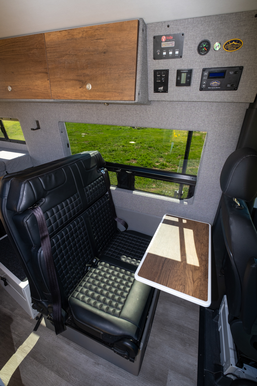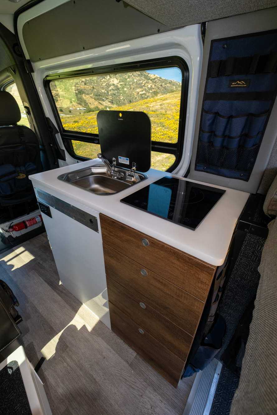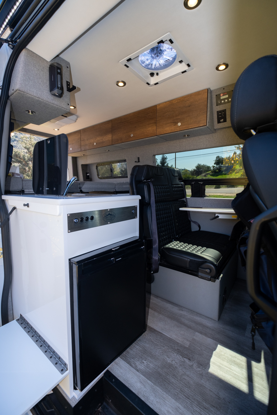 Water is supplied from a 21-gallon fresh tank stored inside the van, which prevents it from freezing and keeps it protected from rocks and obstacles on the trail. The 24-gallon gray tank, on the other hand, is below the van, but shielded with a skid plate and protected from freezing by integrated heating elements. Both the cabin and water system can be heated through the standard Rixen’s Enterprises heating system, which uses diesel fuel instead of electricity or propane. That means you only have to worry about filling up the van at the fuel station to make sure you have everything you need for a warm weekend in the woods. Oh, and don’t worry, it has a built-in cut-off to make sure it doesn’t drain your fuel tank entirely.