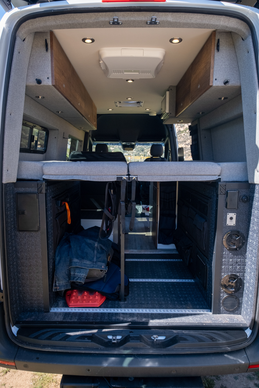 The execution of this cargo space was refreshing, to say the least, especially since most RVs lack a garage section entirely, and those who do have it often forget key details like leaving enough room beneath the bed for mountain bikes. The only downside to the Storyteller garage is that it’s not as wide as some other brands because the water tanks and electronics are stored along the outer walls. While this does take up room, it’s a compromise I will gladly take for the tradeoff of not worrying about my tanks freezing in cold weather or having them hanging off the bottom of the van.