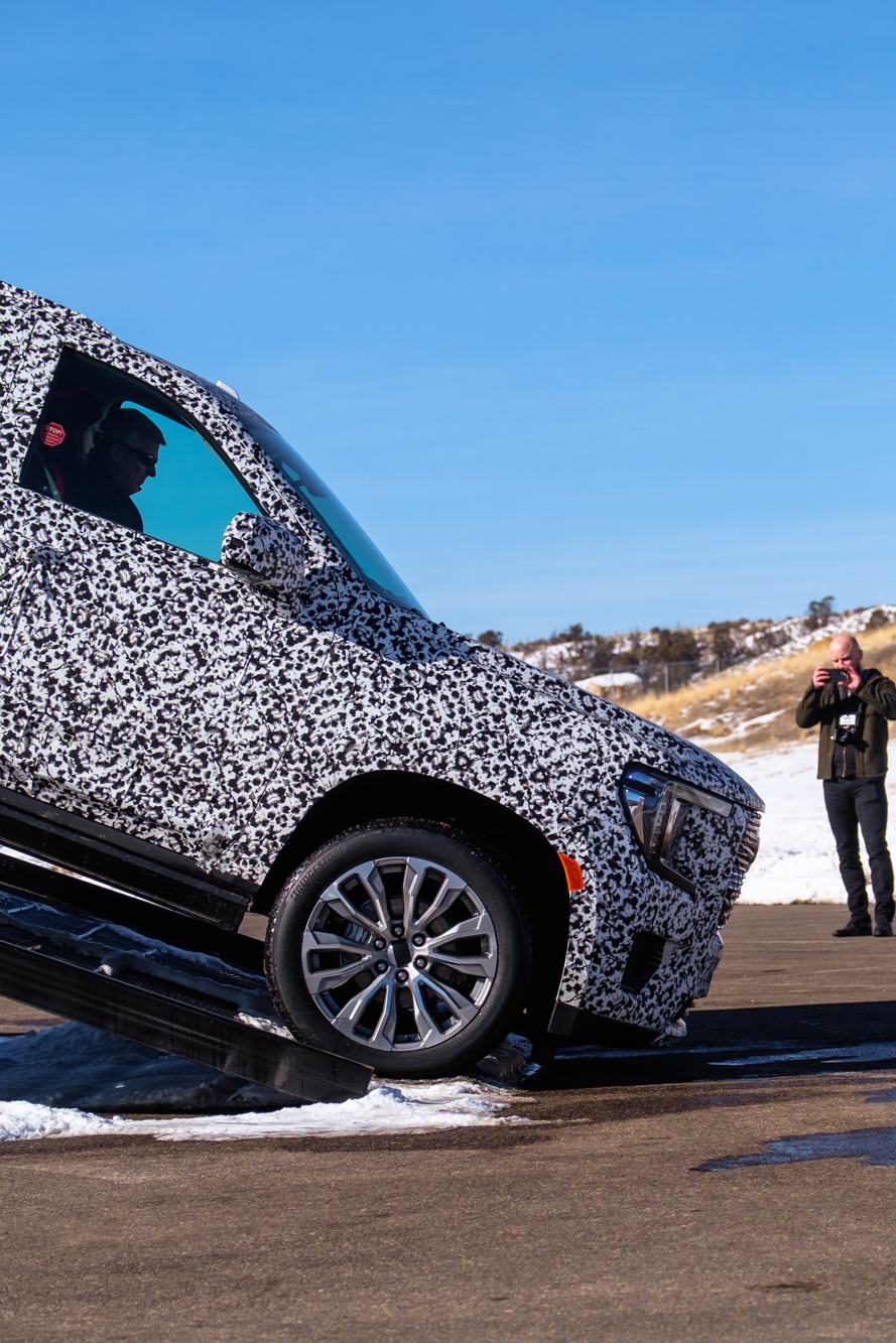 For starters, the eLSD we mentioned earlier works like a charm. Unlike the G80 lockers used in some other GM trucks, there is no aggressive wheel spin and thump as it engages. We had the chance to drive it on an obstacle where the driver-side tires were on ice and the passenger tires were on pavement. Laying heavily into the accelerator, the Yukon seemed to hesitate for a moment as the wheel-slip began, but then quickly gained speed like there was no ice at all. The transition was nearly seamless. On the ramp, the gearing paired with the 6.2L V8 was favorable and the throttle response was quick and predictable. I felt the Hill-Descent Control was much smoother than in previous GMC’s I’ve tested, though that could have been because the Yukon was on an even ramp instead of a series of rocks.