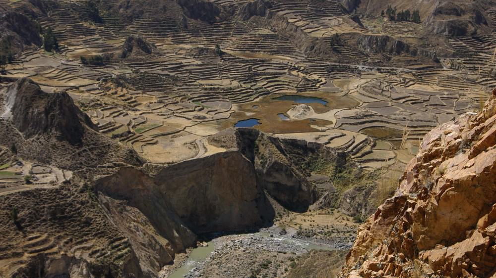 The following morning a washboard ripio road meandering along the edge of the canyon towards Cruz del Condor, ending at a mirador overlooking a deep cauldron in the canyon. The view below into the valley and the meandering river surrounded by the majestic mountains on both sides was absolutely awesome. At first glance staring yonder to a depth of 1200 m we didn’t notice anything in particular, but with a second look we realised that in fact there were folk living in the gorge at the edge of the river. Terraces and platforms with adobe houses gouged out at the base of these enormous mountains, deep down in mother earth. Incredible – if we hadn’t seen it with our own eyes we would have never believed it.
