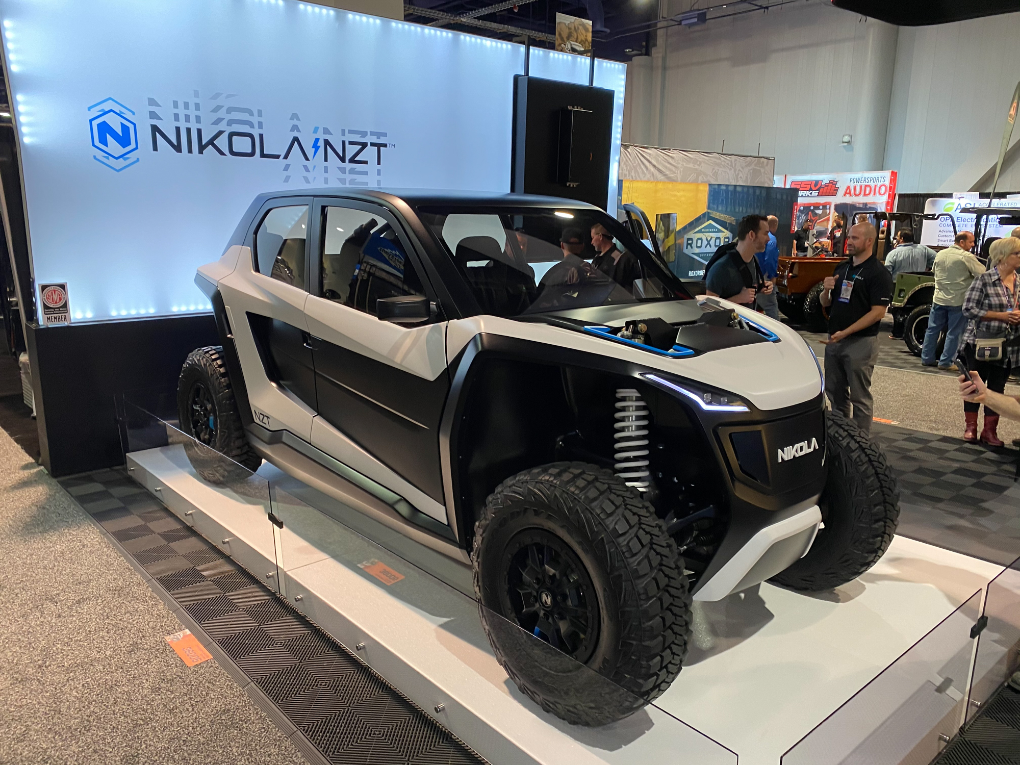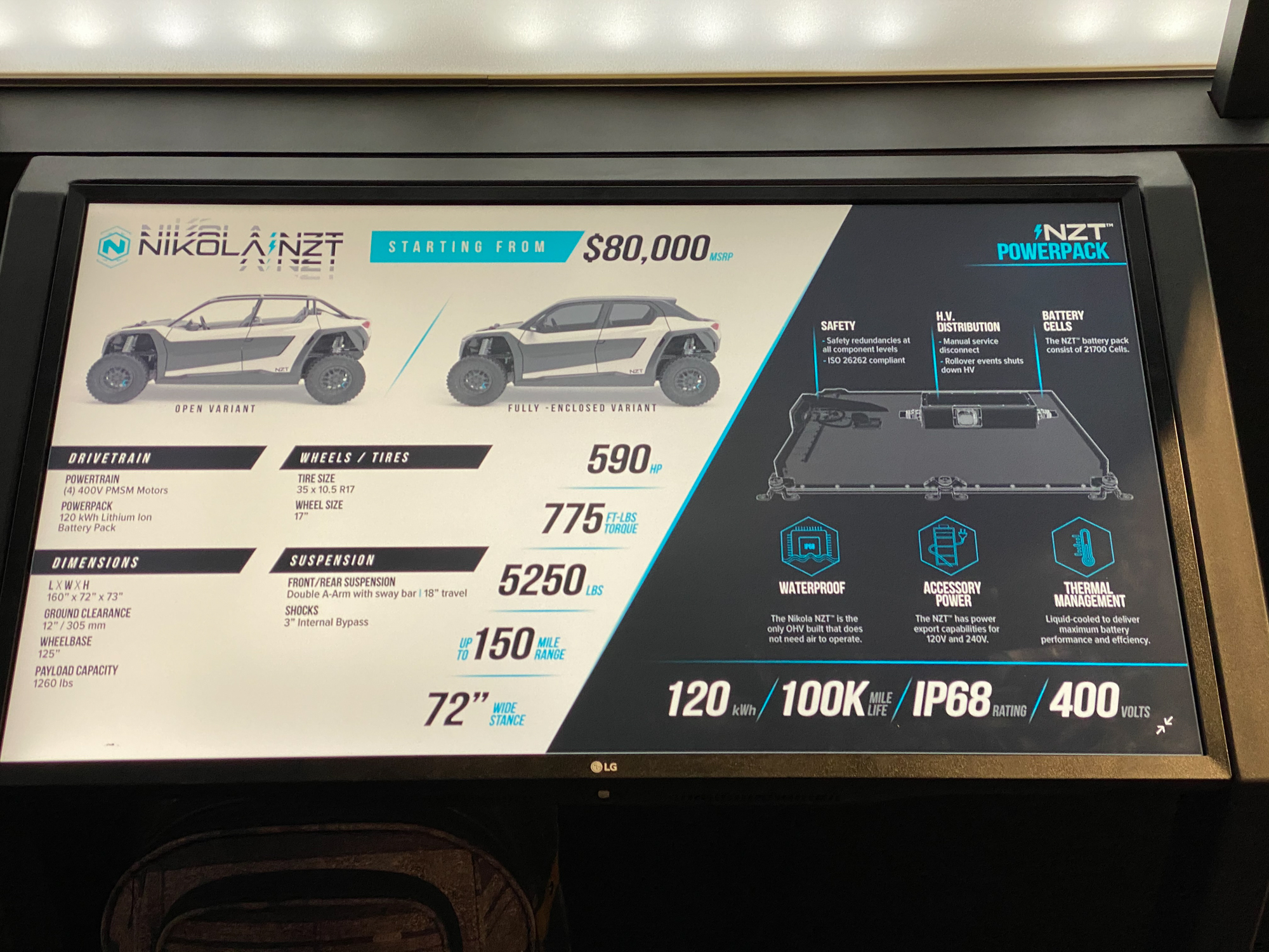 This Nikola NZT 4WD was (very) interesting, sporting 775 pound-feet of torque and nearly 600 horsepower. Traction comes from four, fully sealed (IP67+) independent electric motors, and the suspension provides 18 inches of travel and supports 35-inch tires. It has a bigger payload than a Wrangler JL.