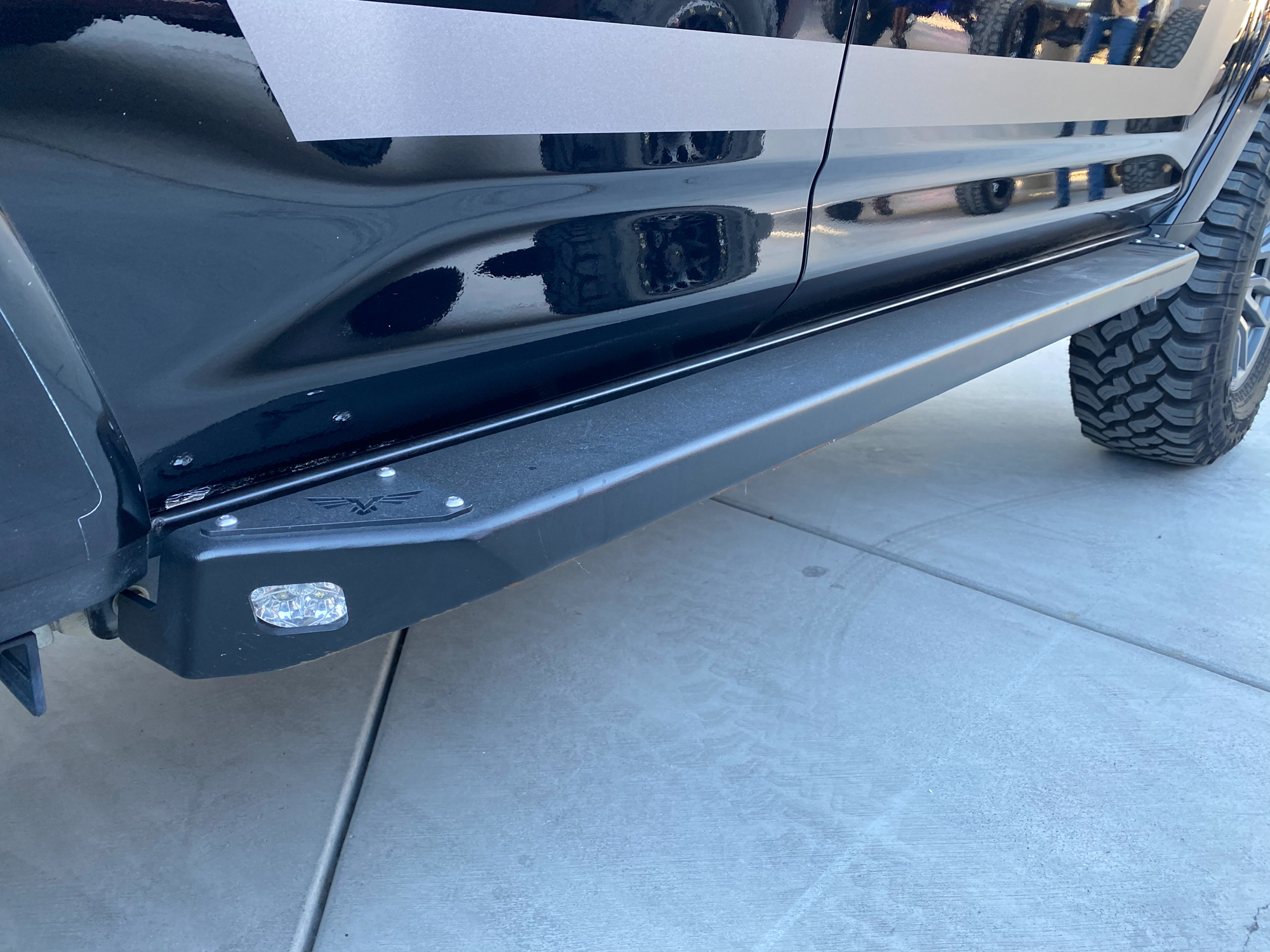 These Victory 4×4 Blitz slider steps might be the cleanest and most integrated solution yet, complete with side lighting (for trail visibility), and a wide-enough profile to use as a step. They tuck up tight against the body and feature a triangulated profile that improves overall strength and clearance. victory4x4.com