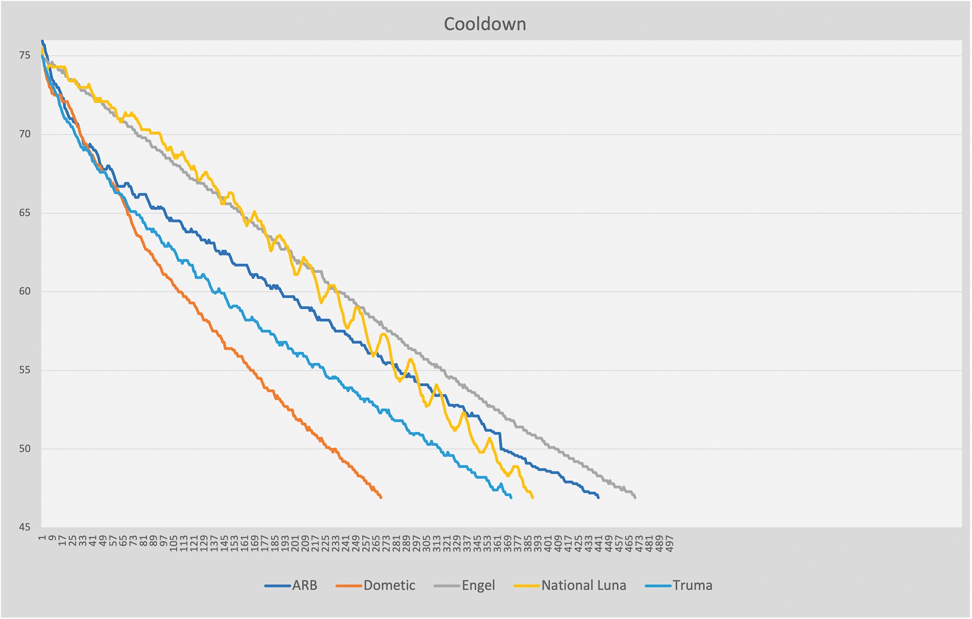 As a control, we set each fridge to their lowest possible set point, and then monitor the temperature of the thermal load by the display on the data logger. The load cools much more slowly than the walls of the fridge, and thereby the fridge’s temperature probe. While most fridge controllers compensate for this effect, it is possible for unusual cooling profiles to present themselves as the fridge is tricked by its own probe data or controller logic. Update: National Luna advised that the system independently cools both compartments, which resulted in the profile shown on the cooldown chart. Cooling over 400 ounces of liquid from room temperature to 46°F is a particularly challenging expectation of a fridge.