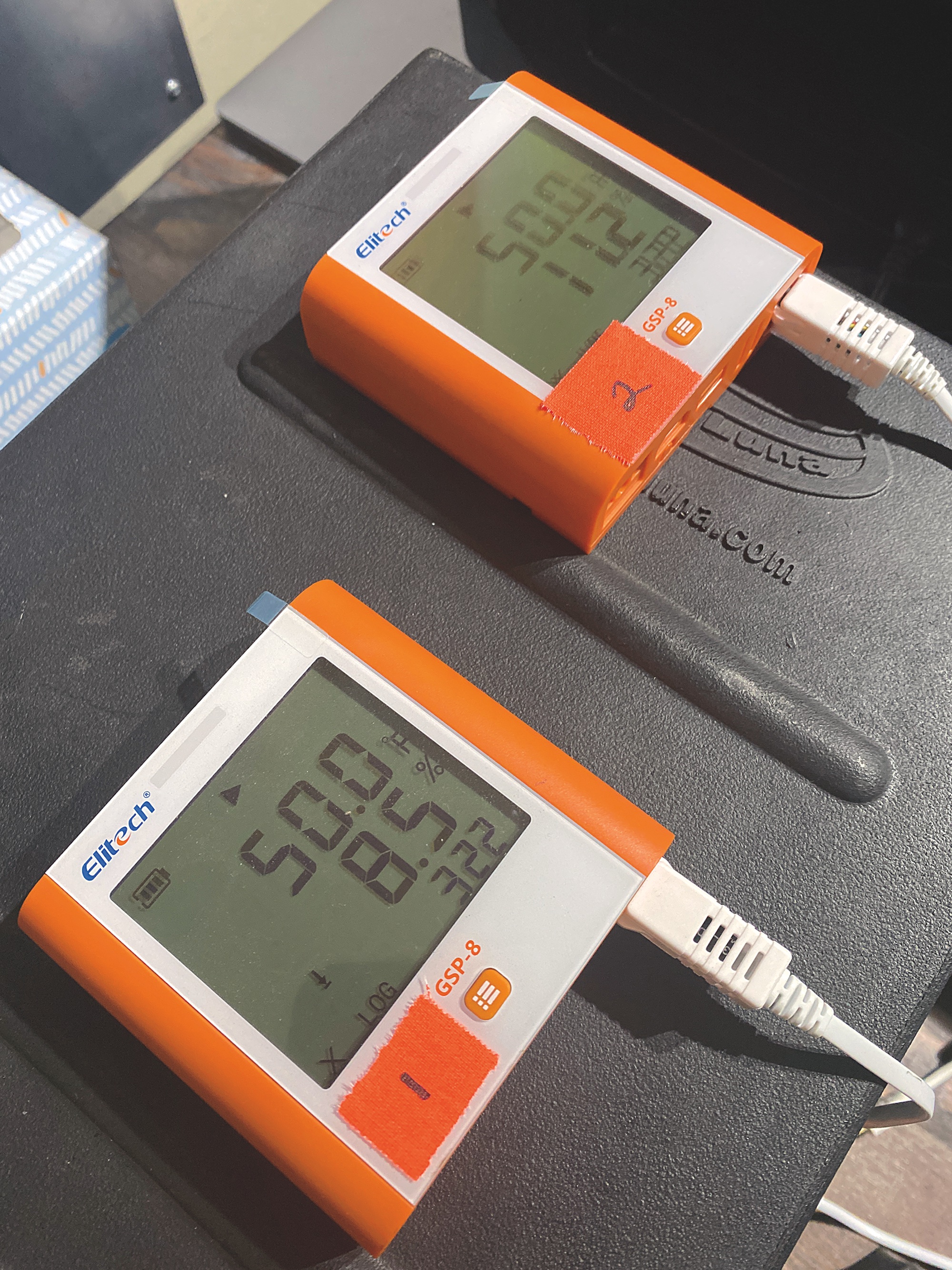 To measure start-up and running amps (which allows for amp hour calculations), we captured the current with a Fluke data logger paired to Garrett’s iPhone. This permits exporting the data as a comma-separated values file (CSV). The data was validated with interval readings from our PowerWerx inline power analyzer. For temperature measurements, we purchased two identical certified data loggers with +/- .6°F accuracy. Both loggers ran during each test to ensure accuracy and to identify possible logging errors. These data loggers export to CSV for analysis and charting. Interestingly, obtaining these units proved quite challenging during Covid as they are used for vaccine storage monitoring. For a fluid thermal load of 423 ounces, we used 38 cans of S.Pellegrino flavored water, arranged without touching the interior sides, placing the temperature sensor probes deep within the center of the load (but not touching the cans) to ensure that the thermal mass achieved our benchmark temp of 46°F.