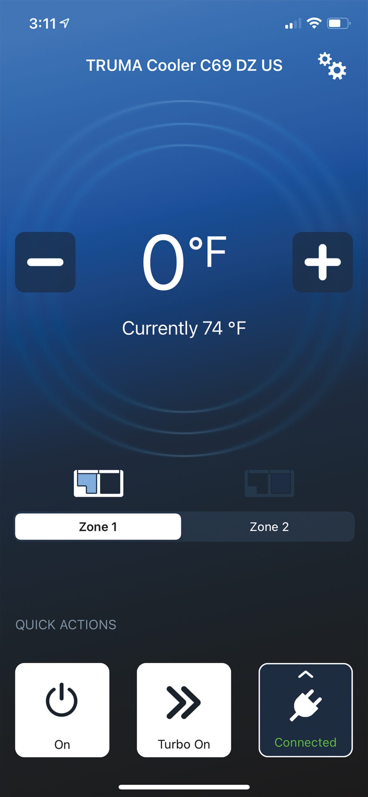 The lineup of Truma fridges is impressive, offering everything from 36 liters to 105 liters. Their adventure line of dual-zone units includes 69- and 96-liter models, so we selected the unit closest to the test size range. Initial inspection reveals robust construction with reinforced rubber corners and handles that fold flat against the sides. Connecting the 12-volt power supply is available on both sides of the fridge, which is a clever solution shared with the ARB. The lid can also be reversed to allow for more placement options. The on-unit display allows for the adjustment of compartment temperatures, along with a turbo mode for rapid cooling. The display shows the current temp or set temp for the individual compartments. Using the smartphone app allows for additional adjustments, including battery voltage at the unit and adjusting the low-voltage cutoff settings.