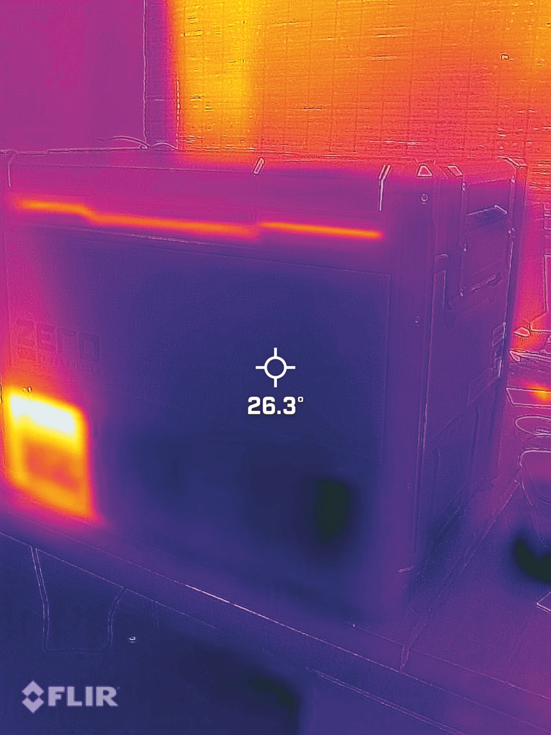 Additional tests included a decibel measurement of the compressor during peak cooling to determine fan, vibration, and other sounds that contribute to a noisy sleeping environment. We also took four cooling vent temp checks with a thermal IR gauge to determine how hot the units ran (to help the buyer consider required cooling spacing and airflow), and we captured Forward Looking InfraRed (FLIR) thermal images of the fridges to look for concentrated heat zones and potential cooling loss areas (for example, around the lid).