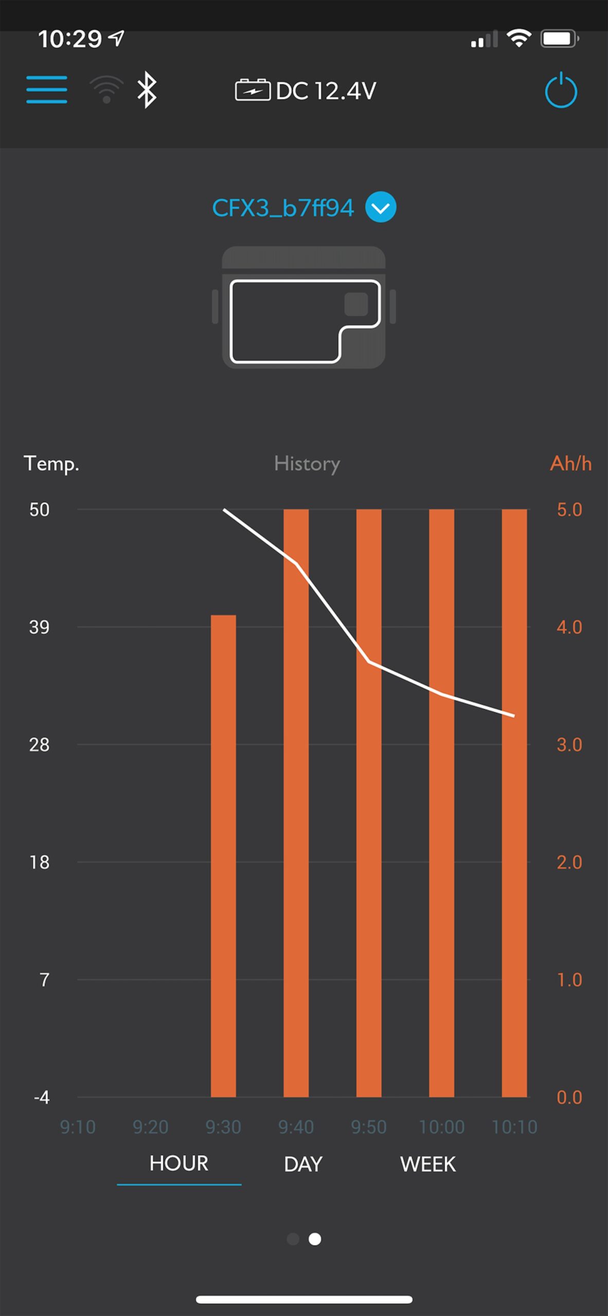 The Dometic provides the most useful app in the test, including amp hour usage by hour, day, or week. We noticed that the graph does not have enough upper limit range, with the unit using above the 5 amp hours shown on the app graph. Despite this, the daily graph is helpful for gauging power consumption. It is possible to change the set temperature in the fridge from the app and see the current temperature, both of which are convenient to the passenger while driving—no more spoiled or frozen food. The last feature of note is the lack of a true freezer, but the ability to make ice. For many travelers, the layout is perfect, providing more fridge space, as well as evening libations on the rocks.