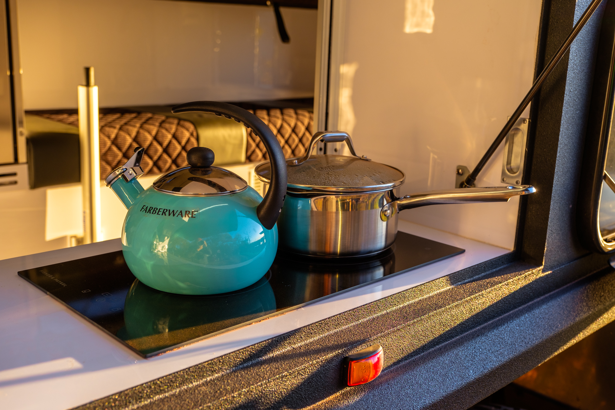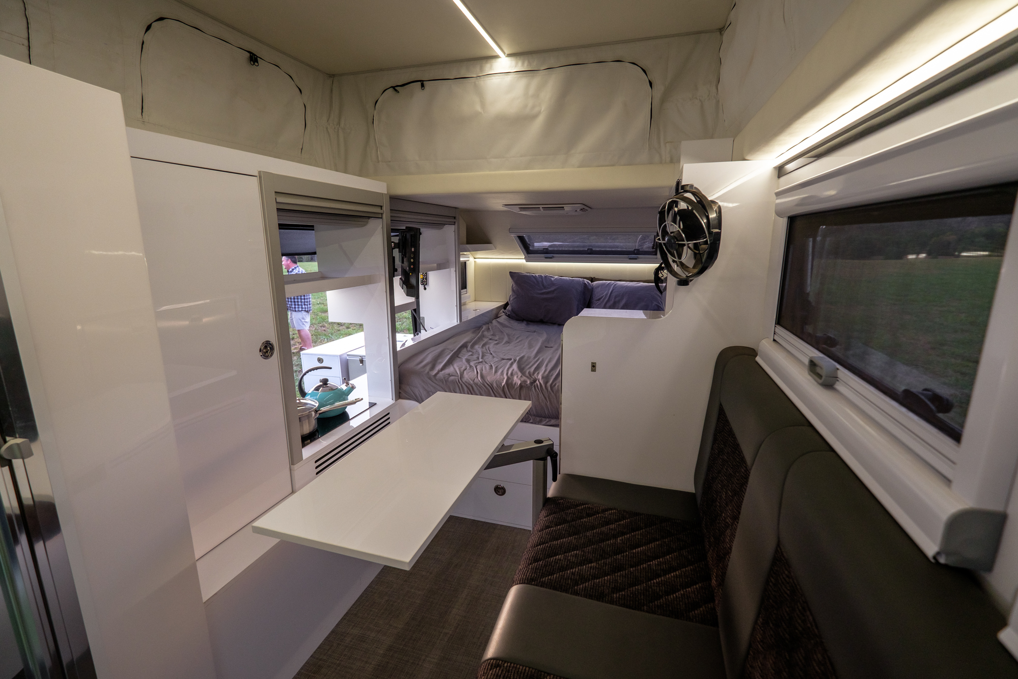 The EXP-6 also suffers from the Australian propensity to design trailers you live around as opposed to inside. Despite having a total length over 20 feet, and a body measuring over 16 feet, the Brüder’s interior is impractical for cooking and working. Take the kitchen, for example. There’s a small upright fridge by the lounge for holding snacks and a few drinks, but the main fridge, food storage, and utensil drawers are on an exterior slide-out that cannot be accessed from inside the trailer. That’s a bit of a problem if you’re traveling the Pacific Northwest where it often rains or passing through Montana in a snowstorm. Say you plan ahead and have the food in the interior fridge with pots, pans, and plates ready to go. The next challenge becomes using the range or sink from the inside, which requires sitting on the bed and reaching through a narrow opening.