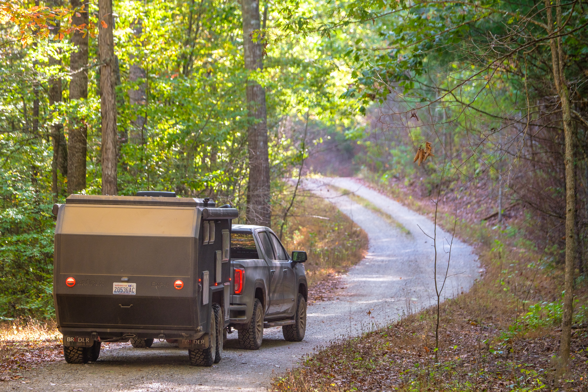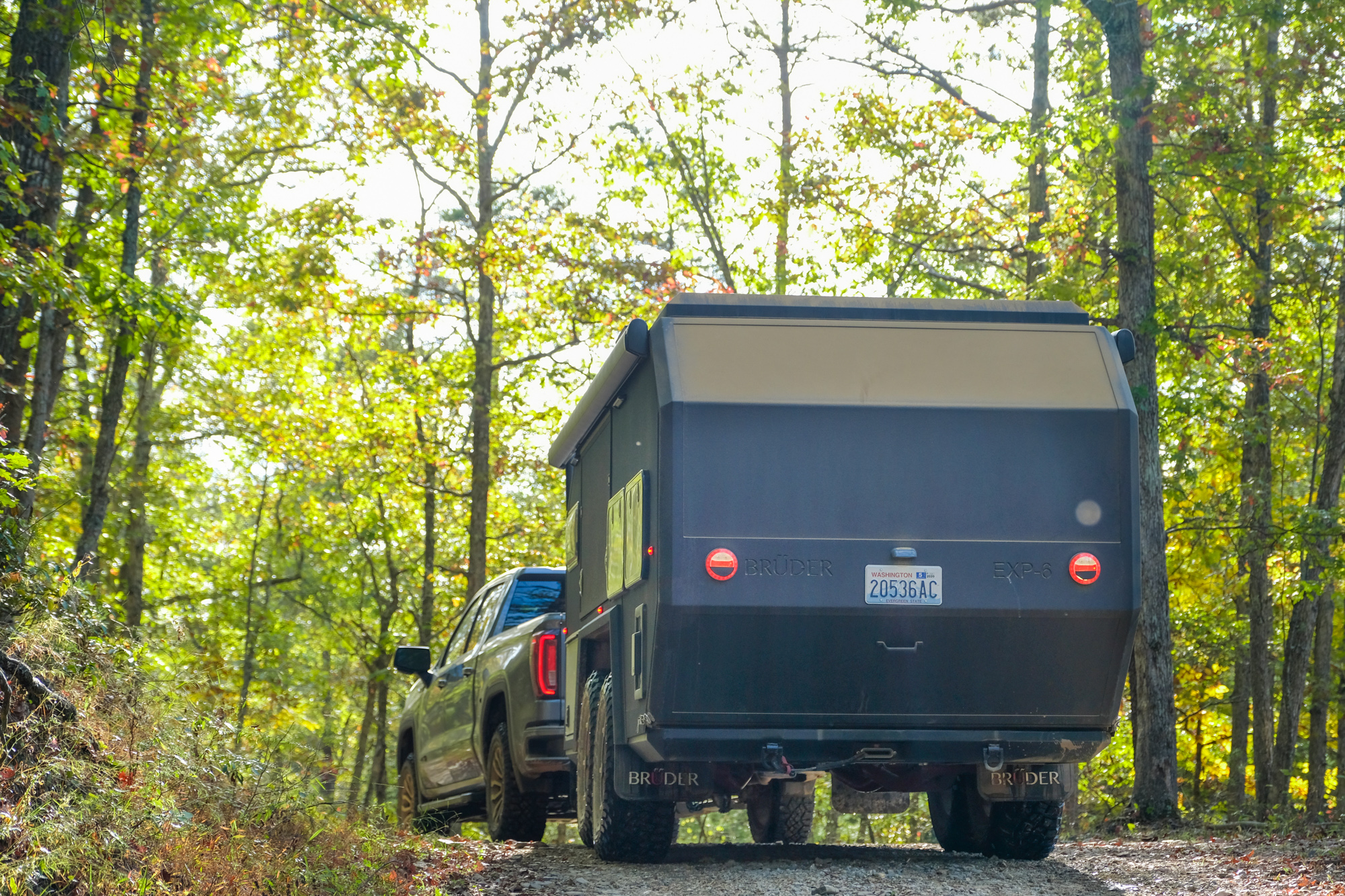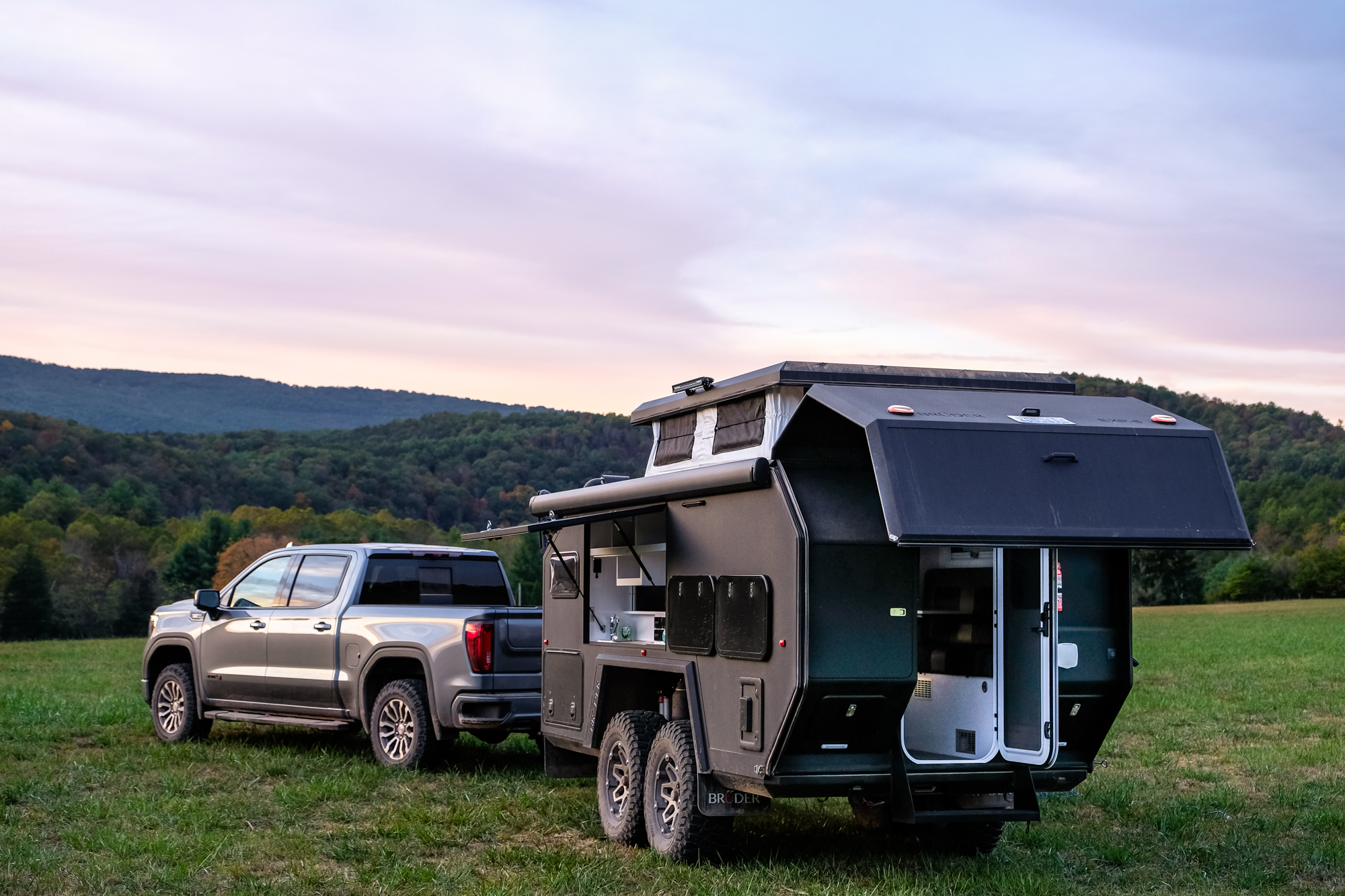 Although the open desert and technical mountain tracks of the Western United States would have been a better proving ground for the Brüder, our chance to test it came just after Overland Expo East in Virginia. We decided to throw it at the winding roads and tight trails of the Blue Ridge Mountains. Our tow vehicle was a GMC AT4 equipped with a straight-six 3.0L diesel boasting a towing capacity of 9,100 pounds, a factory 2-inch lift, aggressive tires, 277 horsepower, and 460 pound-feet of torque. Add in the heap of integrated towing features and trail cameras, and it was an ideal pairing for the evaluation.