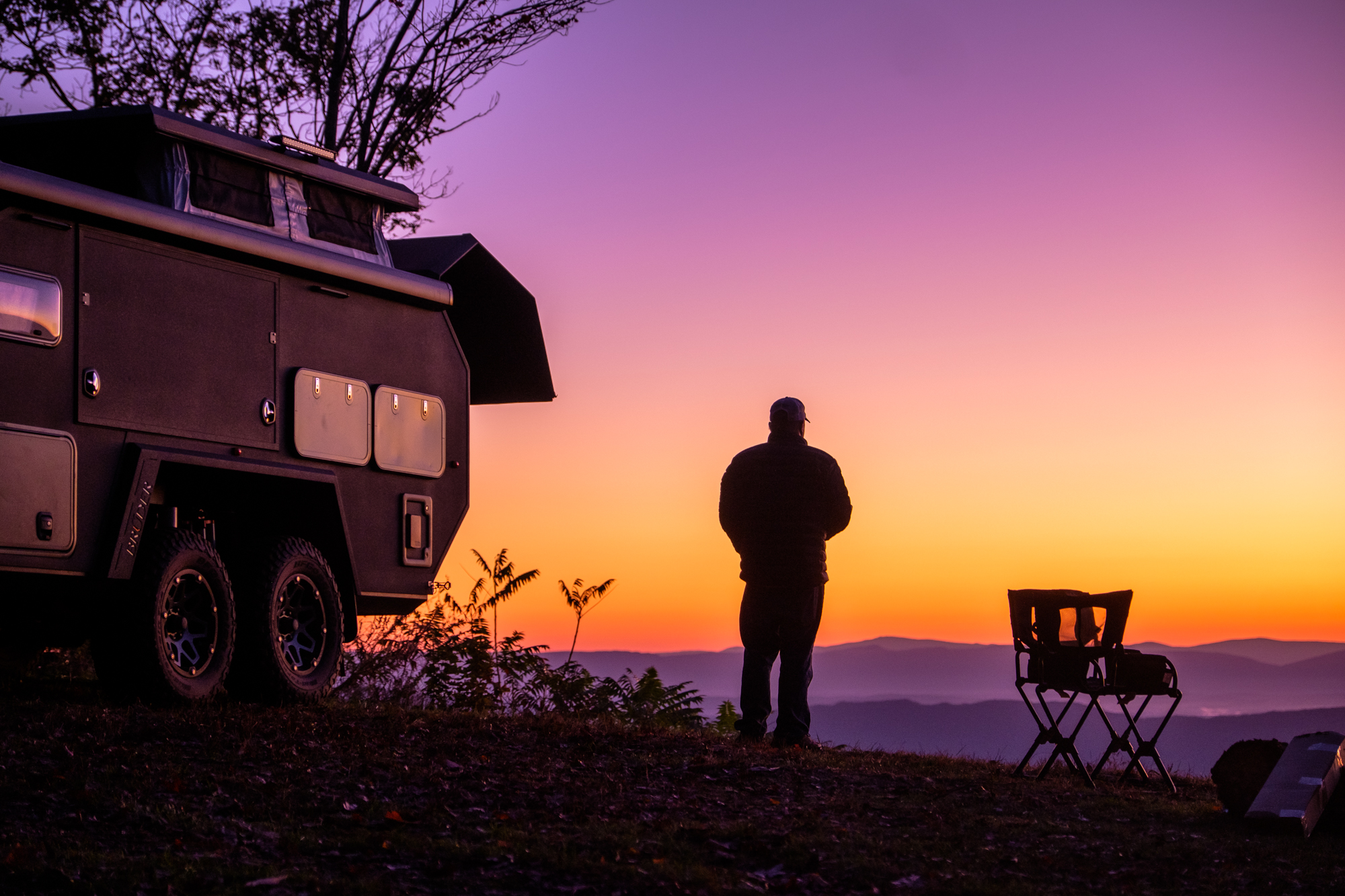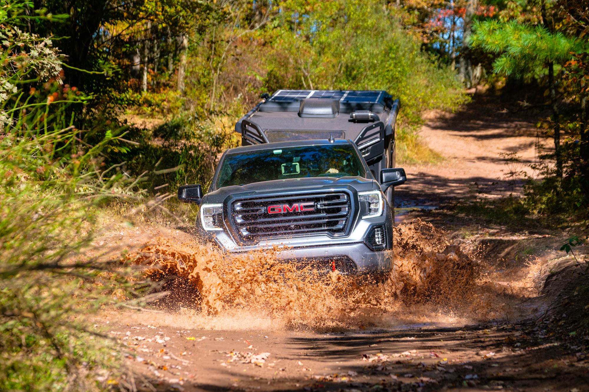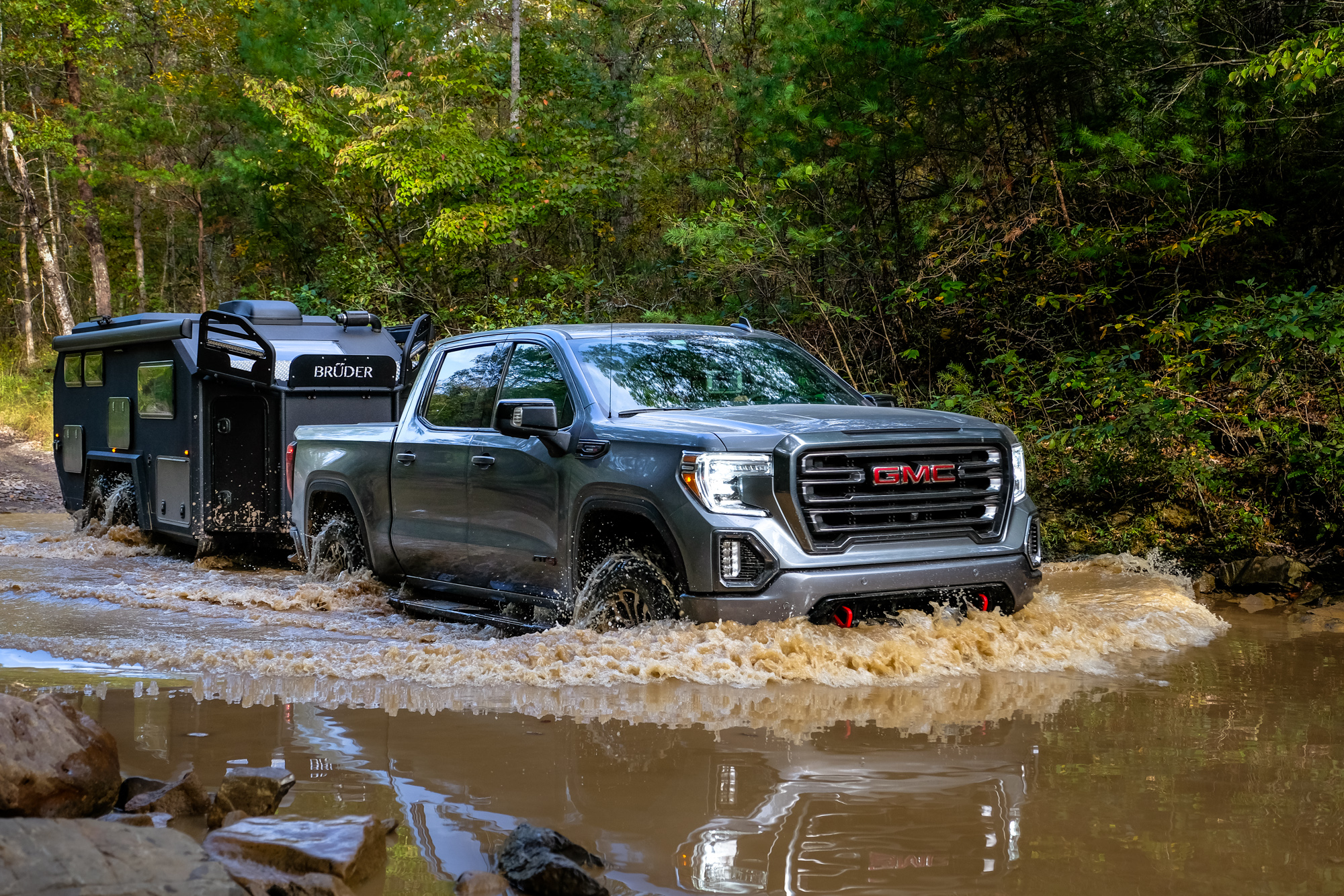 Although the open desert and technical mountain tracks of the Western United States would have been a better proving ground for the Brüder, our chance to test it came just after Overland Expo East in Virginia. We decided to throw it at the winding roads and tight trails of the Blue Ridge Mountains. Our tow vehicle was a GMC AT4 equipped with a straight-six 3.0L diesel boasting a towing capacity of 9,100 pounds, a factory 2-inch lift, aggressive tires, 277 horsepower, and 460 pound-feet of torque. Add in the heap of integrated towing features and trail cameras, and it was an ideal pairing for the evaluation.