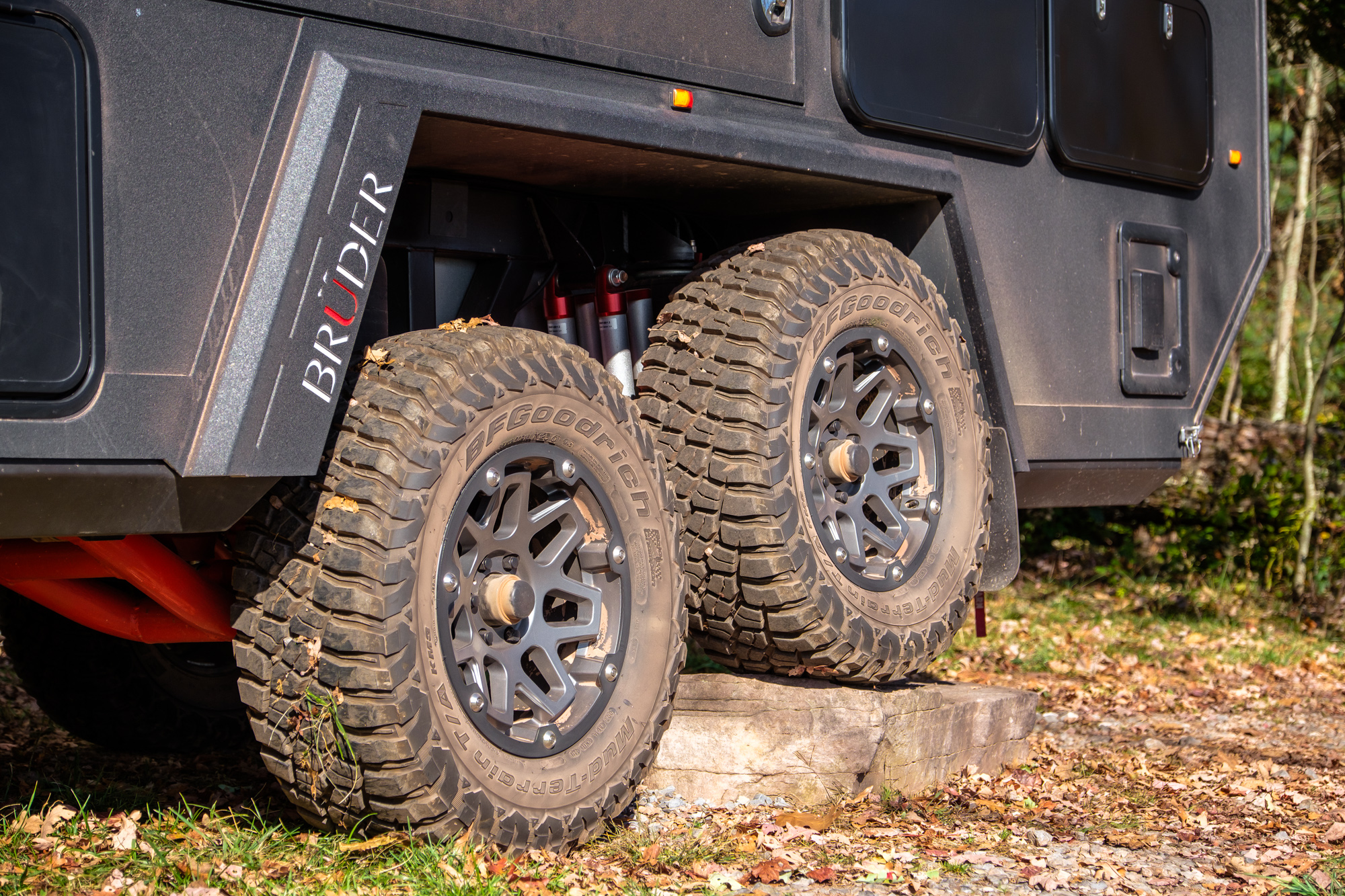 The air suspension gives the Brüder three available ride heights for loading, driving, and clearing tall obstacles or water crossings, but it’s the secondary tricks that amazed me. Some are fairly obvious, like auto-leveling the trailer in camp. Then there are the EXP-6’s impressive abilities to match the ride height to your vehicle or tilt to one side in order to compensate for aggressive off-camber situations on the trail. My favorite feature is the ability to retract a single suspension arm to change a tire without using a jack, or even keep it retracted while driving if you blow multiple tires.