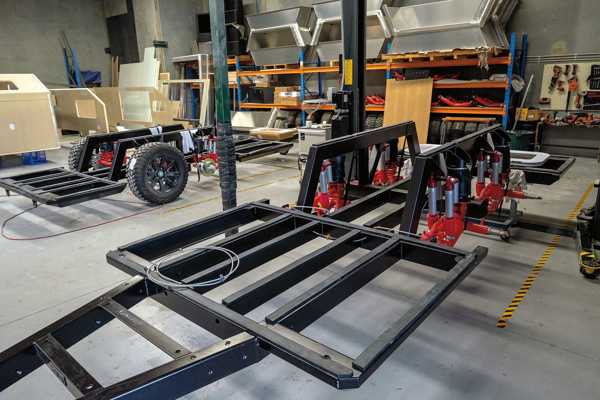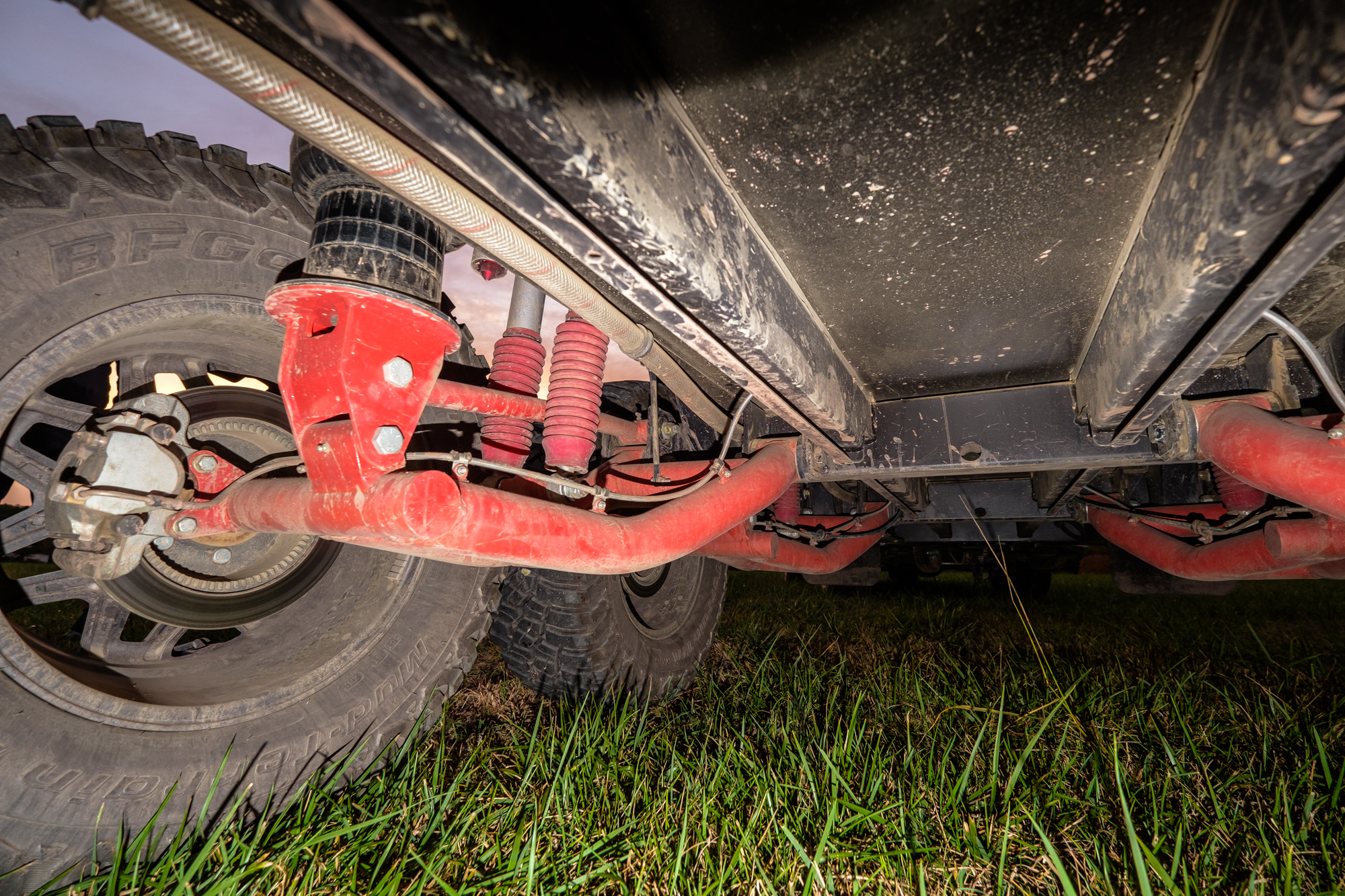 The suspension is where things were really taken to the next level. The four massive suspension arms are constructed from 450-grade, high-tensile, stainless steel rounds, shaped to provide clearance for sliding over rocks. These are then paired with eight high-performance, remote-reservoir shock absorbers, four vented disc brakes, and four heavy-duty air-suspension bags inflated by an ARB twin compressor and storage tank. The combination gives the trailer 12 inches of adjustable wheel travel, with the ability to manage long runs on corrugations as well as larger-impact events during high-speed driving in rough terrain.