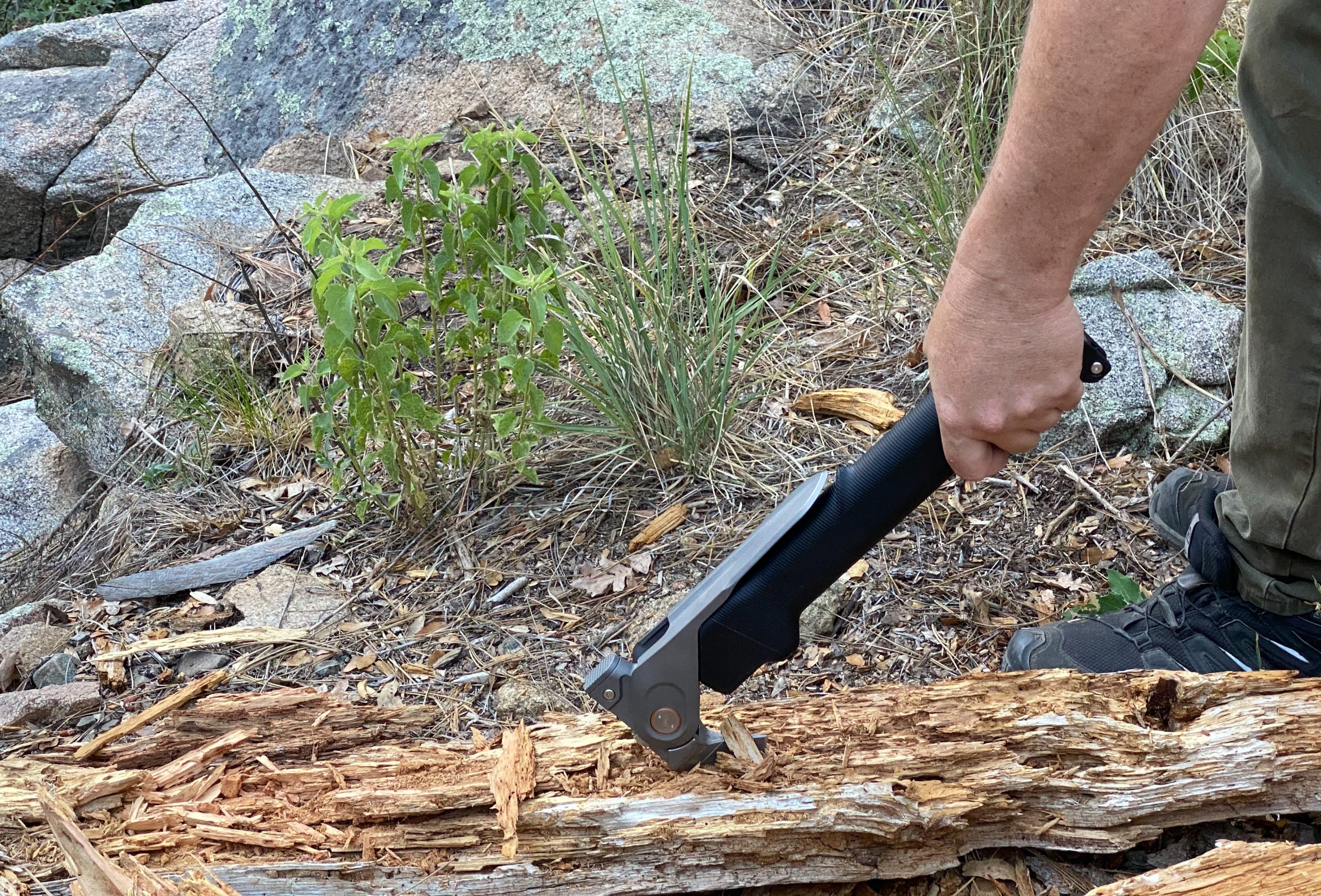 There is both a spade integrated for trenching and an ax for splitting and light felling. It’s great for camp work with firewood or when nature calls.