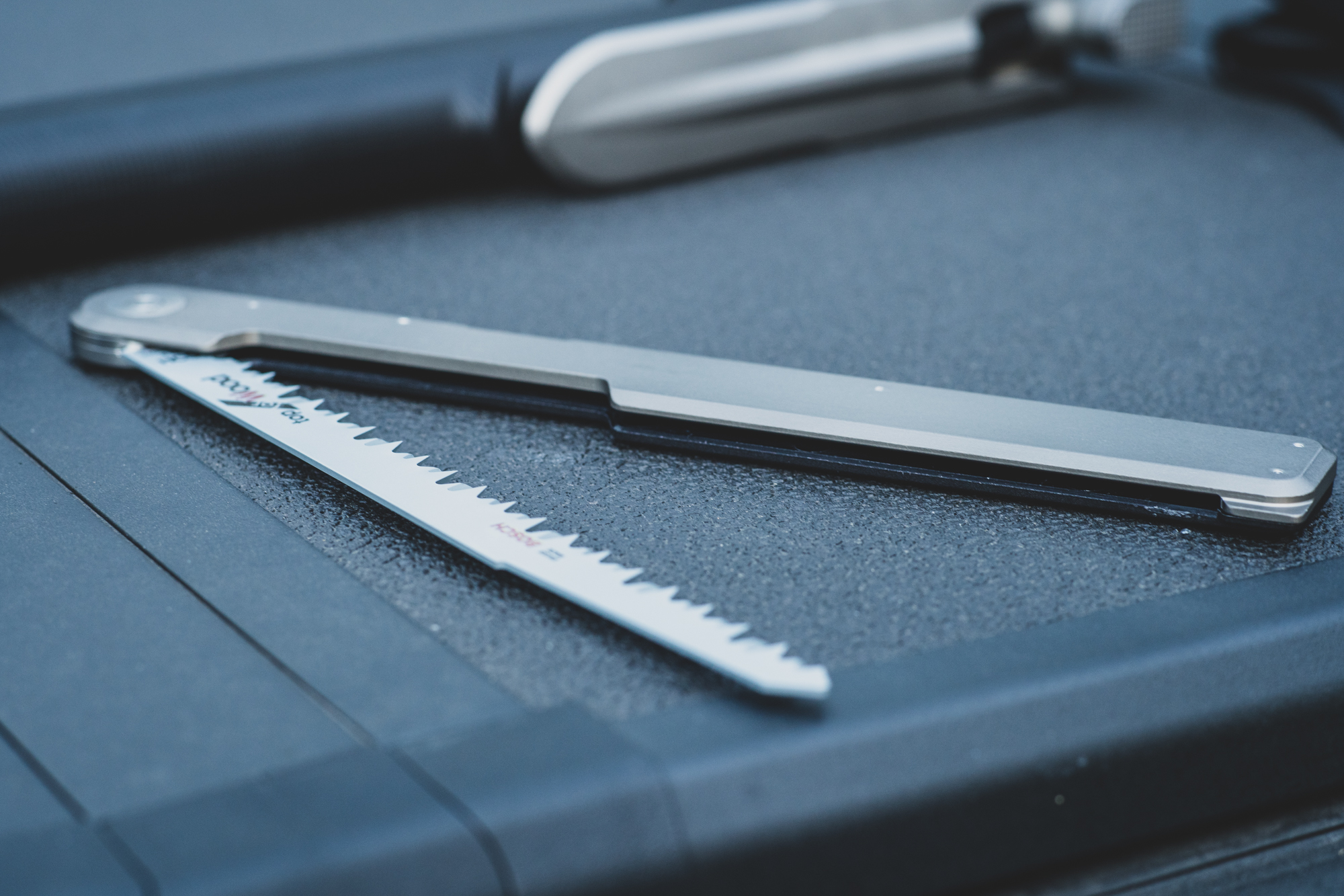 The handle can accommodate several tools or a small storage box. I configured the Combar with a knife and a saw. It would be easy to swap out for a metal cutting blade too (for field repair work on the vehicle). The end cap release is difficult to open with a gloved hand due to the small purchase on the release.