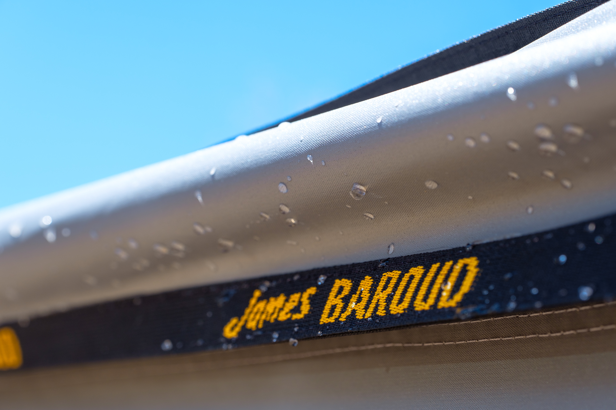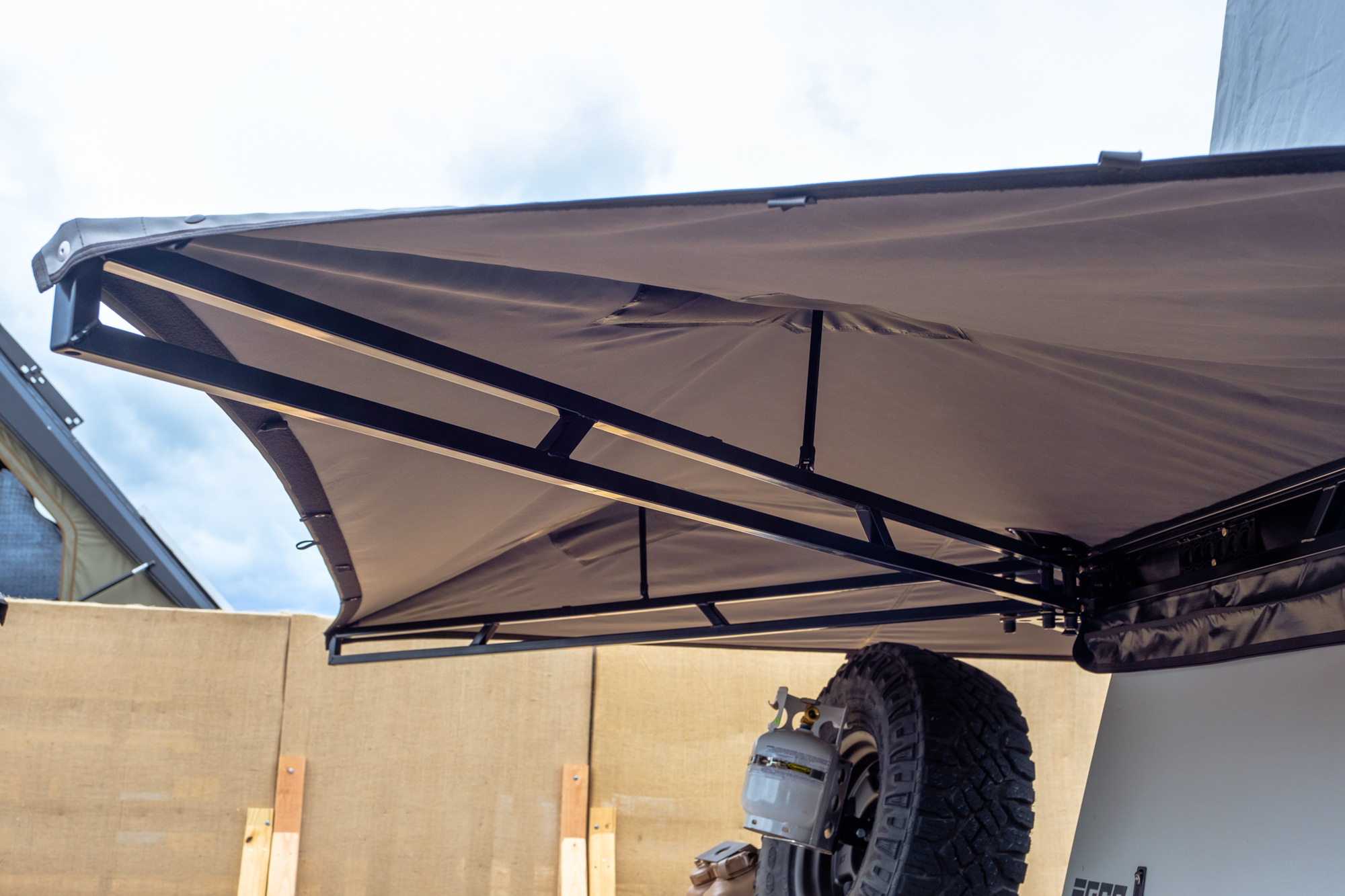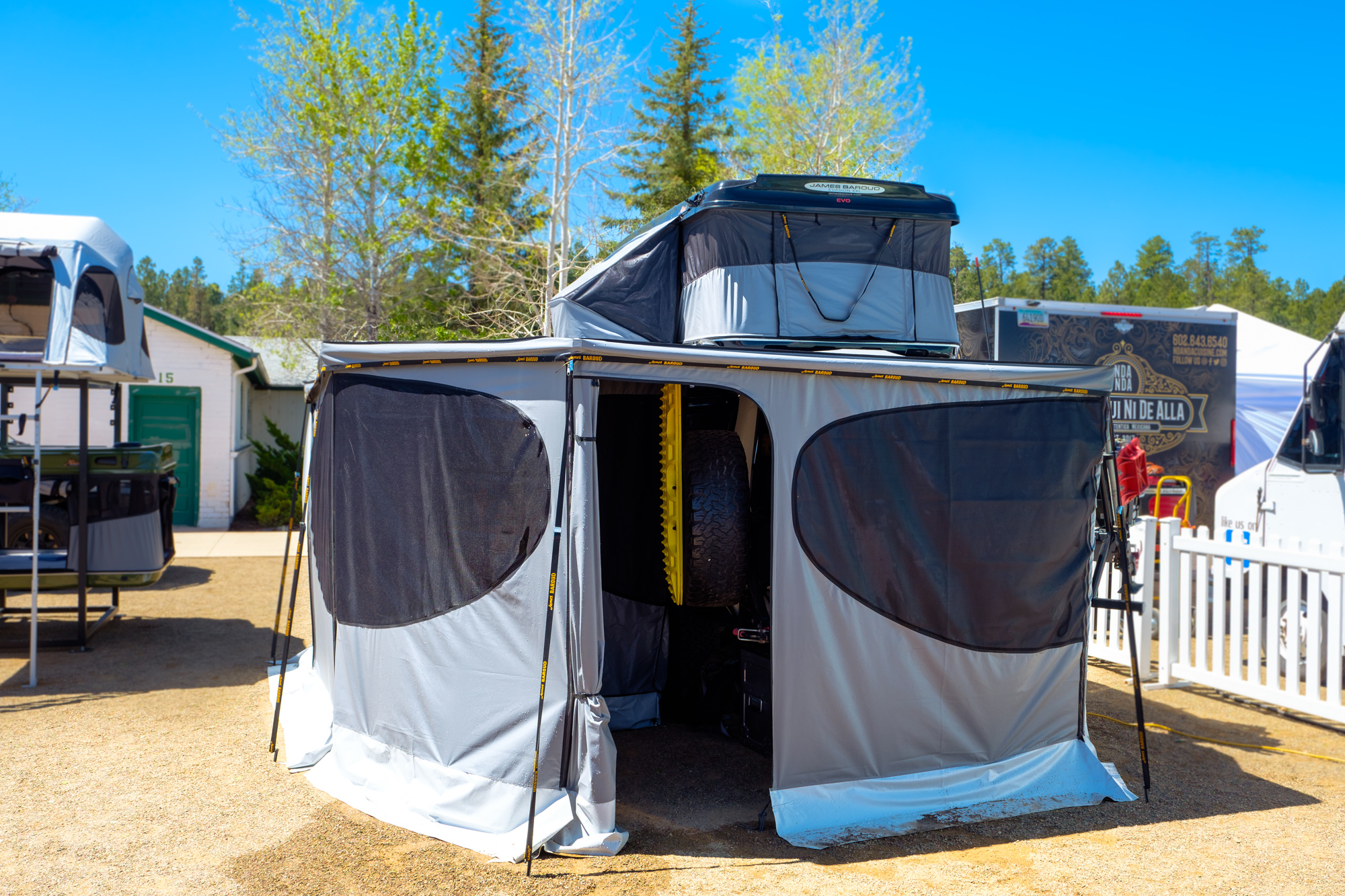 As you’d expect, the Falcon is also packing the proprietary aluminized fabric made famous by James Baroud’s tents, which reflects light to keep the underside of the awning cool, is UV and mold resistant, and is naturally waterproof so it will not lose its ability to shed rain over time. We did note that the awning is only freestanding in “fair weather” and that there was some pooling of water after the rain storm we experienced during the event, common issues with many 270 awnings.
