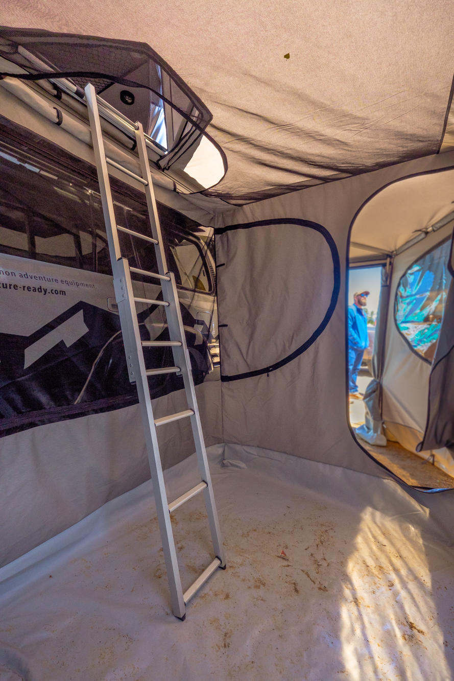 Although the form of this tent is fantastic, the design is all about function. For starters, the entire thing is just 6 inches thick when closed to minimize its profile in the wind and retain fuel economy. It also weighs as little as 140 pounds, which is 50-60 pounds lighter than most of its competitors, reducing the roof load and improving vehicle handling. The aluminum shell is corrosion resistant, and all the hardware is stainless.