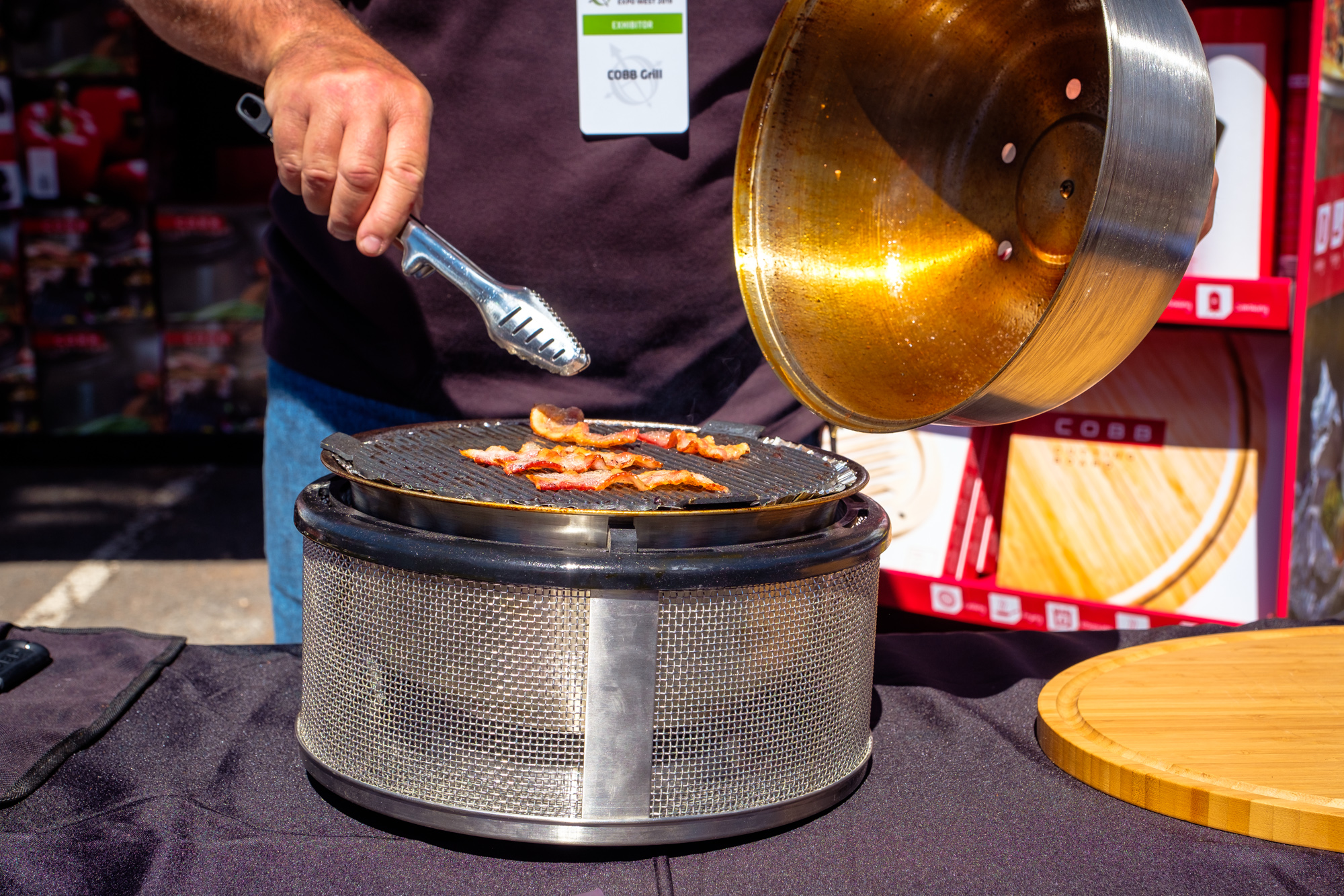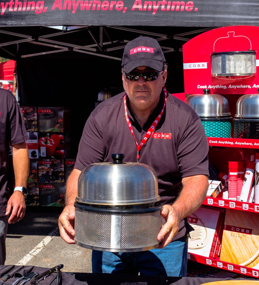 If you want to catch someone’s attention at Overland Expo, cooking food is a pretty good way to do it. If you want to keep their attention though, you might try doing something a little more dramatic. For example, casually picking up a flaming charcoal BBQ by the base, and offering folks a piece of sizzling bacon off of it. That certainly raised my eyebrows and piqued my interest enough to see what COBB grills were all about.