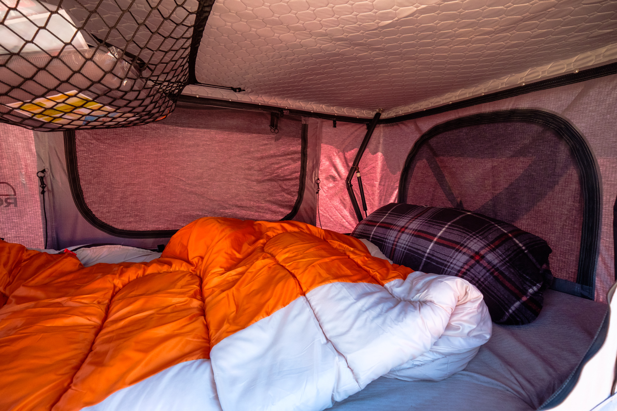 Wrapped around the exterior you’ll find a standardized track system which makes it easy to adjust hinges, add locks, and mount accessories like awnings. It does utilize a clamshell design to eliminate excess structure and reduce weight, but don’t think that it compromises on space. Roofnest built the tent with 6 feet, 8 inches of length inside, with an aggressive opening angle that provides 10 feet of height for your feet within a mere 4 feet of the hinge end of the tent. This means that even tall folks like myself can sleep comfortably without their feet being squished by the end of the tent.