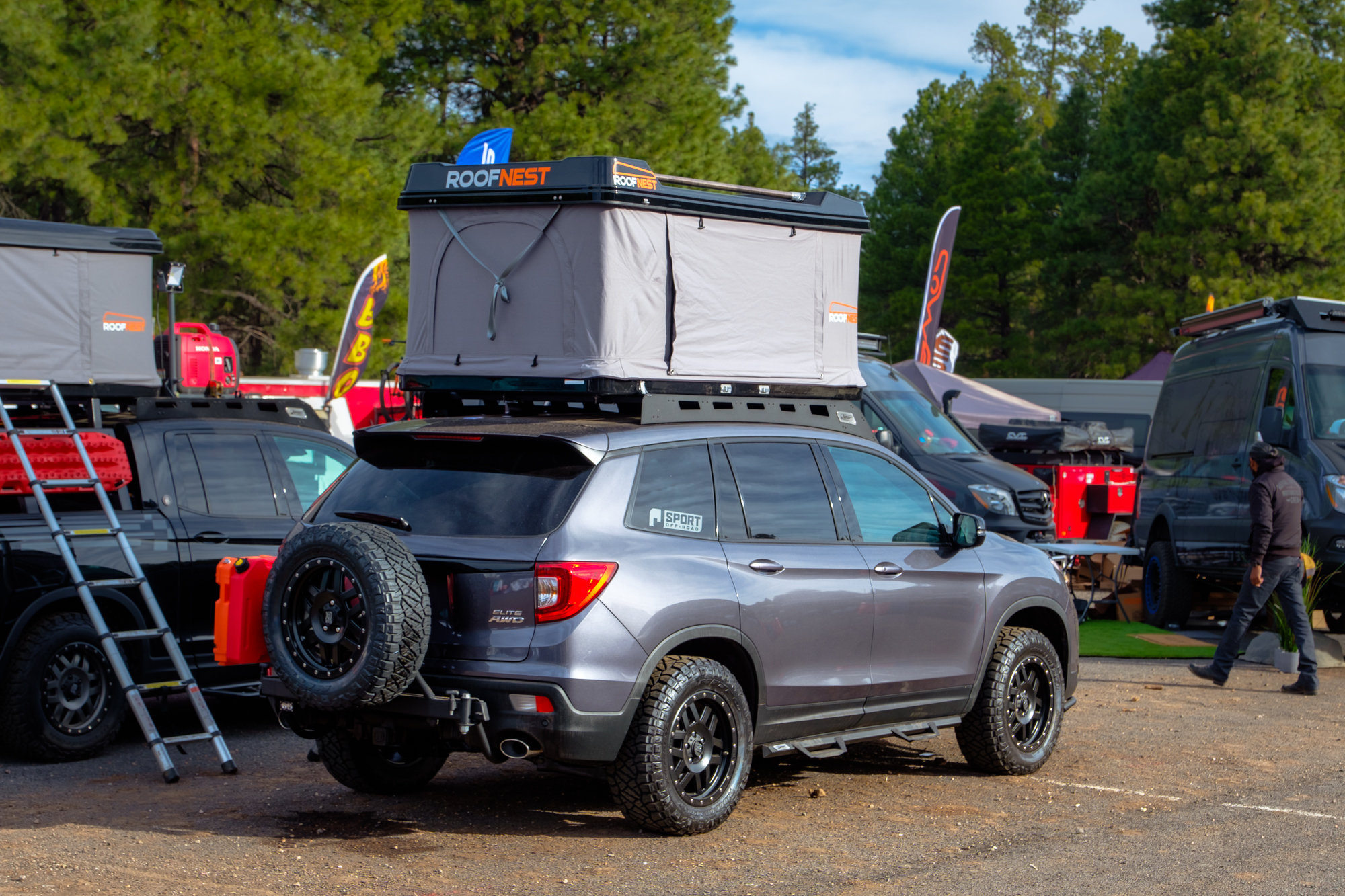 We showed up to the Roofnest booth ready to check out their latest hard-shell model, the Sand Piper, but we ended up seeing a whole lot more than that. Tucked away in their campground far outside the event’s vendor area we were fortunate enough to get a sneak peek at a prototype hard-shell tent that is so new it hasn’t even been named yet. It took some convincing, but eventually, Roofnest agreed to let us give you a look at the slimline beauty below in addition to their all-new Sand Piper.