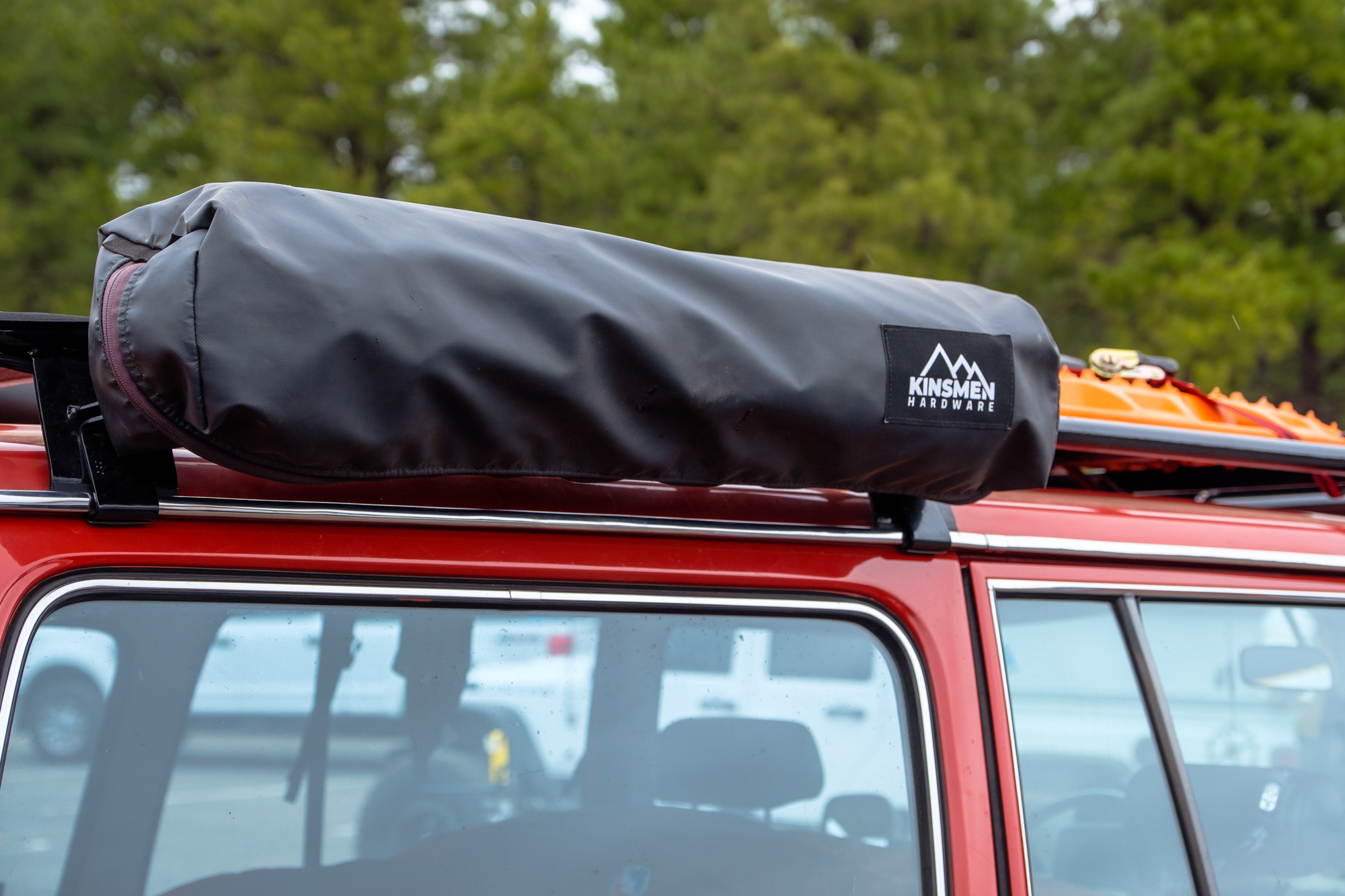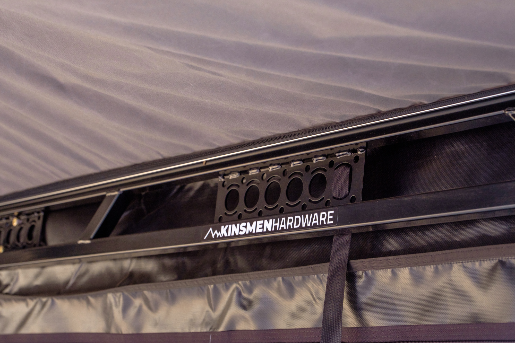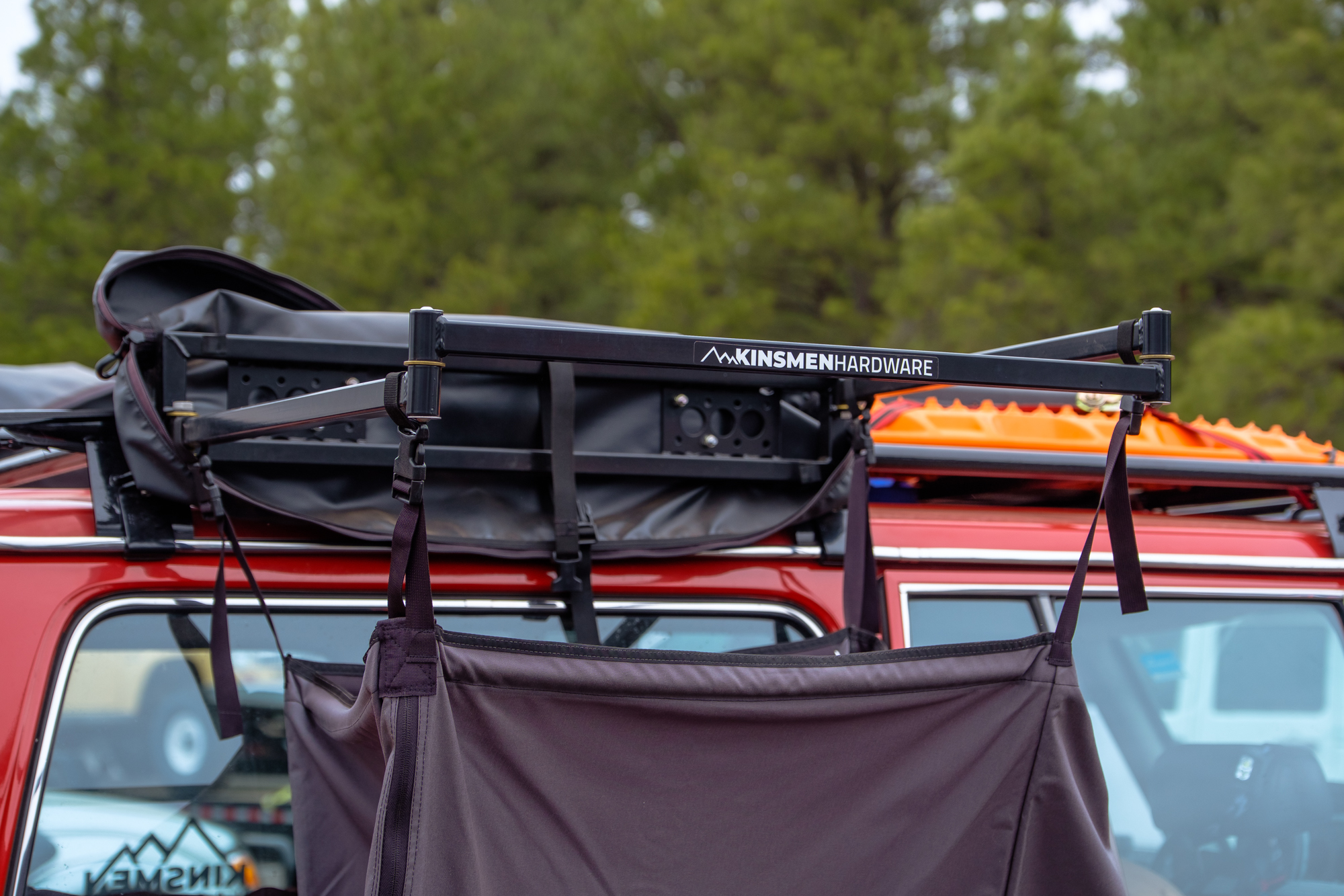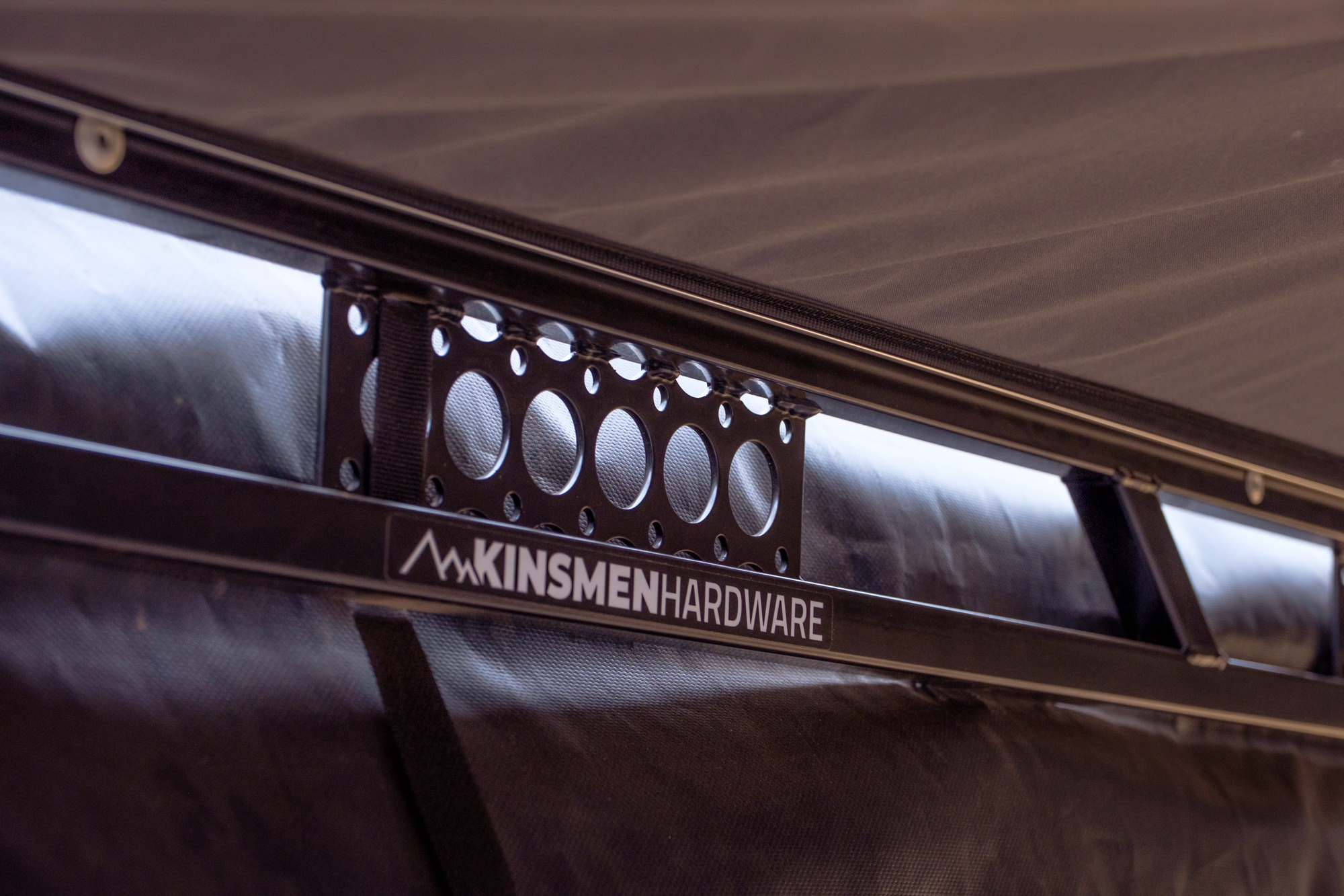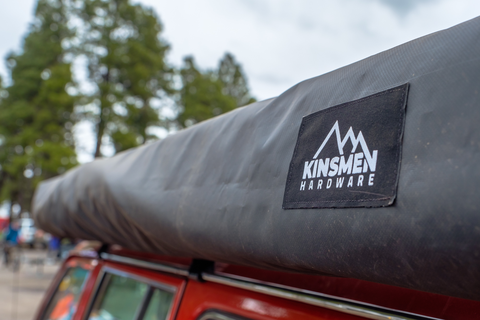 In the last issue of Overland Journal, I had the privilege of pitting several 270 awnings against each another to see who would come out on top. I’m sad to say that we couldn’t grab one of these Kinsmen awnings for the test, because I have a suspicion that the competition would have really heated up. Let’s start by looking at the basics. This product is handmade in the USA from tubular steel with brass and stainless steel hardware and a durable marine-grade Sunbrella fabric. While the steel makes it heavier than most awnings, we were told about 10 pounds heavier than an Alu-Cab, it also allows it to be slim while retaining incredible strength. The official test rating on their website claims the awning will withstand 35 mph winds or stand up to heavy snow without support, but their demonstration of jumping up and swinging from one of the armatures was far more impressive.
