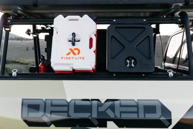 While night driving is best avoided, it is wise to upgrade standard vehicle lighting with a good set of LED lights. Decked went all out on their build with a light package with the dual purpose of aiding driver visibility on the road and practical lighting in camp.