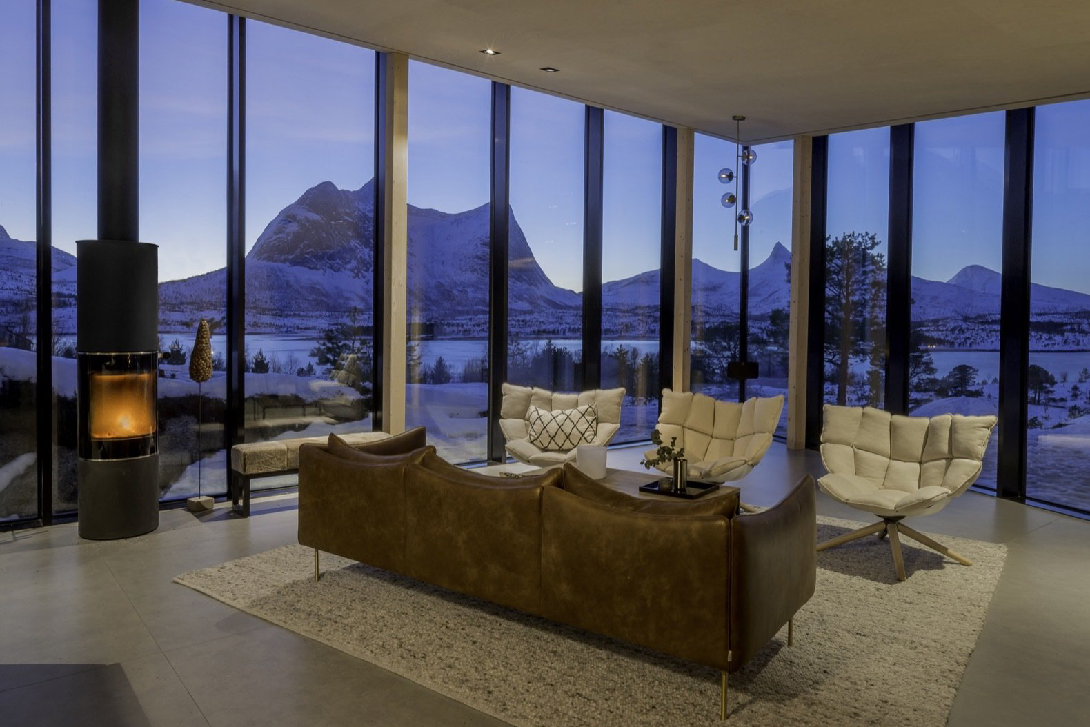 The glass cabin, which is located in Northern Norway, is the private wilderness retreat of Frode Danielsen and Tone Beathe Øvrevoll (originally sweethearts during the conception of this project and now happily married). Working with award-winning architect Snorre Stinessen, the two conceived a home that would be a welcoming place, one that celebrates and complements the mountain and fjord views of the surrounding landscape. The culmination of their collaboration, the Efjord cabin, is comprised of two main volumes. The larger space is divided into two floors, with sleeping areas and a sauna while the second, smaller volume, functions as an open-plan living area with dining area and entertaining space. Huge floor to ceiling windows provide expansive views in all directions.