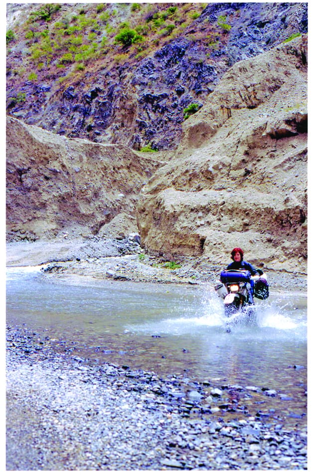 We fought our way onwards, struggling against the elements, using every ounce of physical strength in our upper bodies just to keep moving forward. It would have been bad enough on a sealed road, but on this potholed, rutted, gravel hell that stretched out in front of us, it was almost impossible to keep moving in a straight line. With the bikes leaning at a 45-degree angle and the engines screaming at full revs in second, we pushed on, every muscle straining; it was the only way to maintain a grip on the road. “Oh my God!” we shouted at each other in utter disbelief. “This is insane!” But we could barely hear our cries over the wail of the wind.