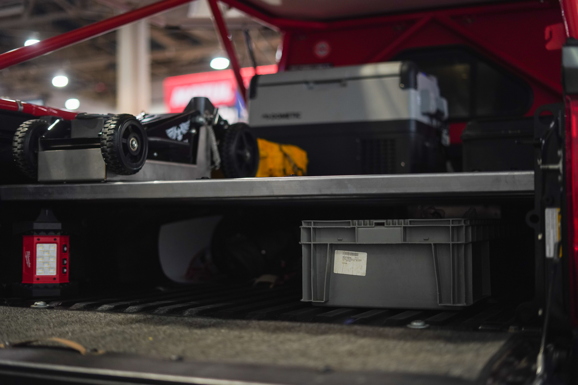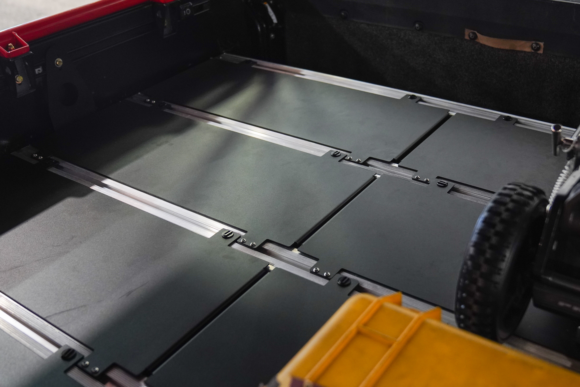 The core structure isn’t anything earth-shattering, a set of cross rails with an integrated T-slot track which runs across the truck bed. This provides two levels of storage, thus increasing the total useable space in the vehicle while making it easier to organize and secure your gear. Things start to get a bit more interesting with their flat aluminum panels, which span the gaps between each rail to create a modular deck. These can be moved or rearranged easily, providing access to anything below the surface.