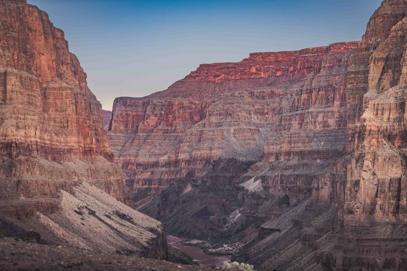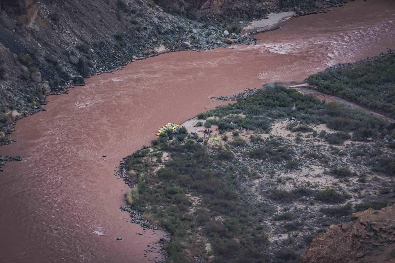 We made our way down over the loose rocks and broken lava fields to our final campsite of the trip, at Whitmore Canyon Overlook—700 feet above the Colorado River. Our timing could not have been any better, as we descended into camp just as the sun set over the hills above us. Looking below, we could clearly see a group of rafters also pulling up to shore to camp for the night.