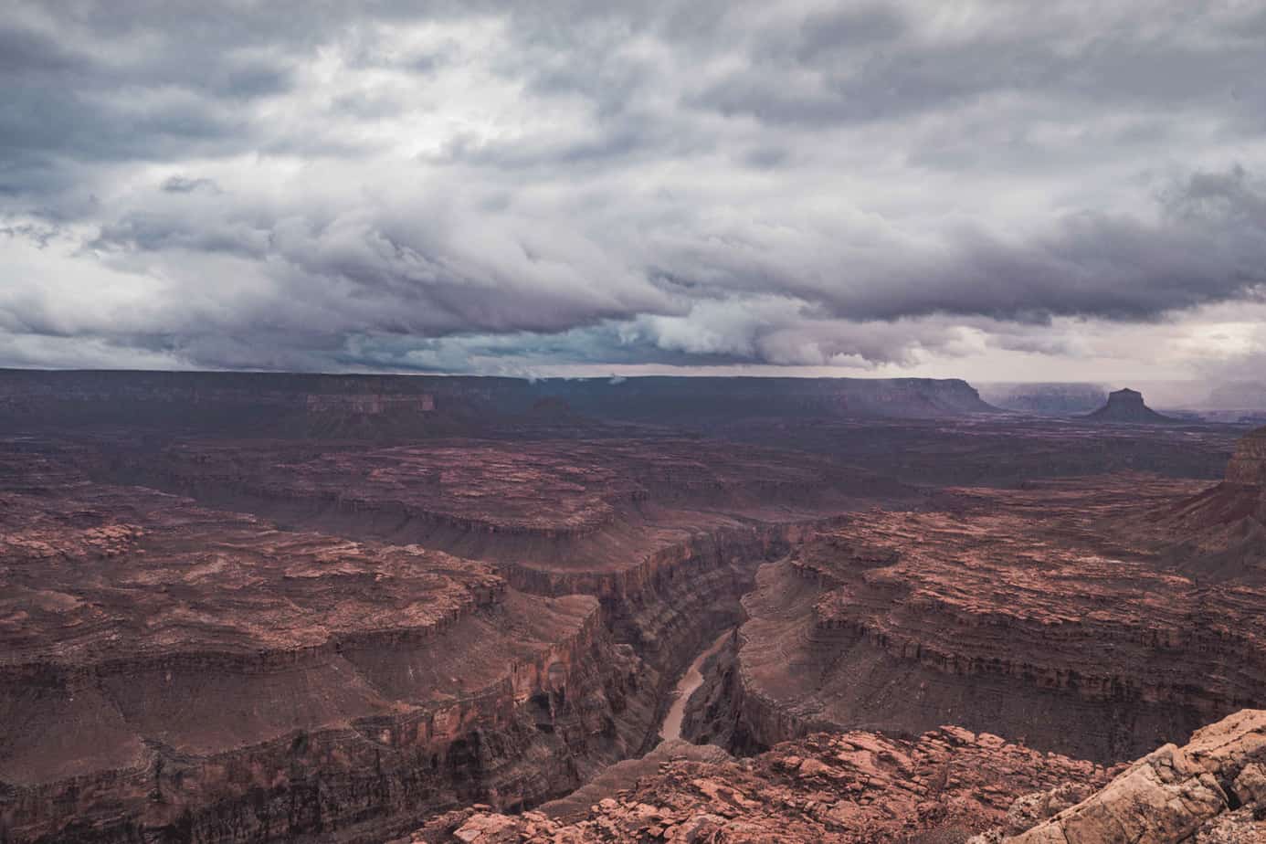 That night was not an easy one. A major storm blew through our campsite almost 12 hours earlier than anticipated, pummeling us with heavy winds, rain, and hail. A small break in the weather that morning allowed us to snap a few photos of the canyon and quickly pack, but the downpour began yet again as we made our way out of camp. Due to the deteriorating conditions we encountered on the slippery clay trail, we chose to ride out the remainder of the storm in town, refuel, and grab a hot breakfast. We would later find that the same storm system would dump 12 inches of snow on the section of trail we had cleared the previous day, effectively closing it for the season.