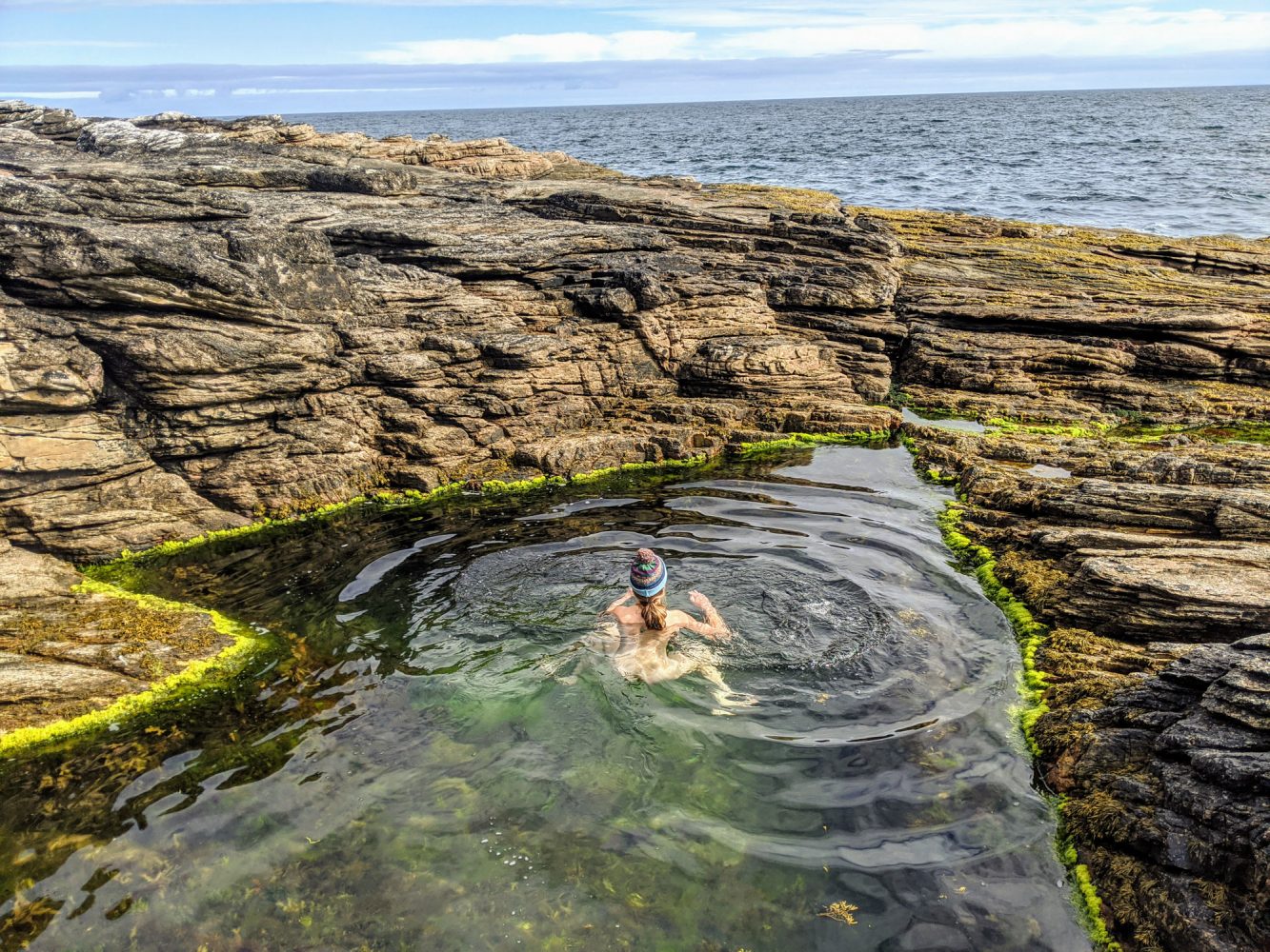 From then on, we swam every day, whatever the weather. One morning we’d be snorkelling among pulsing moon jellyfish in a turquoise bay, the next, skinny dipping in a rock pool on one of the most northerly points on the British mainland—nothing but the cold, wide ocean between us and the Arctic circle. Below, glassy green waves broke on a deserted beach, and a pair of shaggy Highland ponies ate slimy tresses of kelp.