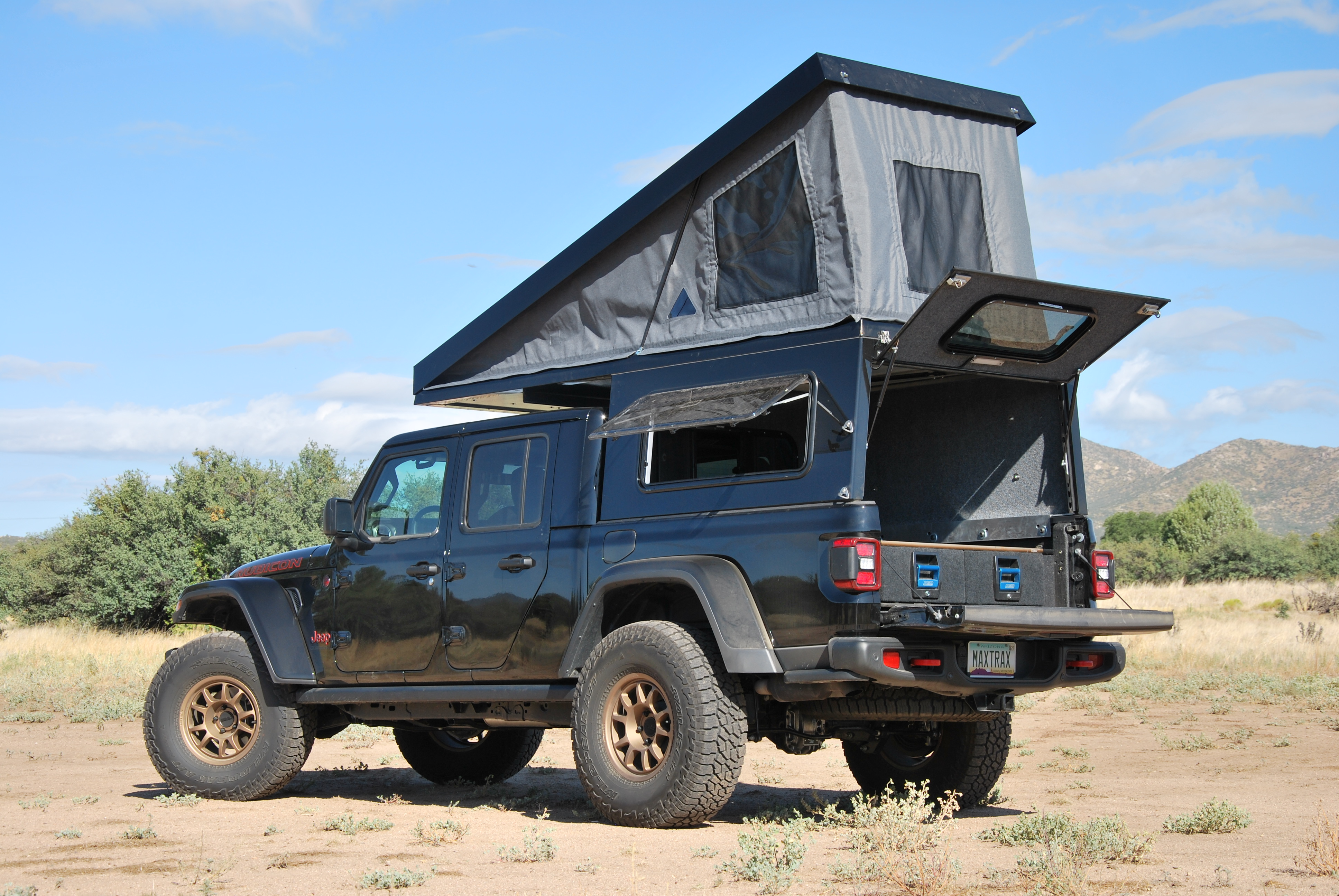One of the most important attributes of the new Gladiator is payload, which from the factory can range from 1,200 pounds for the Rubicon model, to 1,600 pounds for the Sport (Max Tow) package. This leaves more than enough reserve capacity to fit the 350-pound aluminum Summit Habitat camper top to the bed, and still have payload for people, equipment, and basic modifications. The Summit has already been sold for other vehicle models and has proven to be extremely popular, like on the full-size Ram.